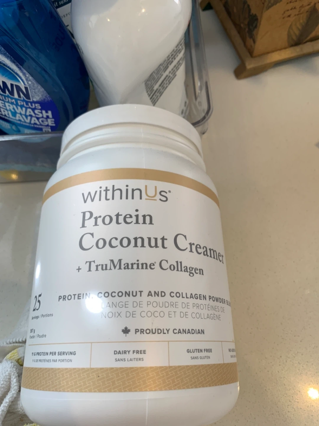WithinUs Protein Coconut Creamer + TruMarine Collagen powder. It's dairy-free and gluten-free. Contains 11g of protein per serving.