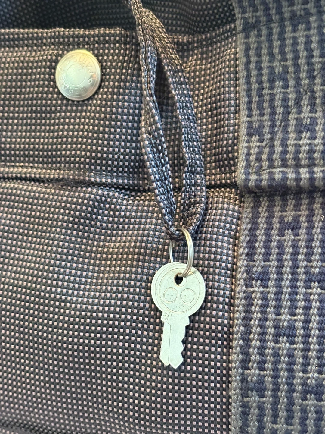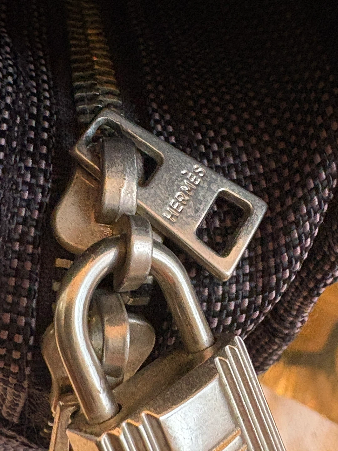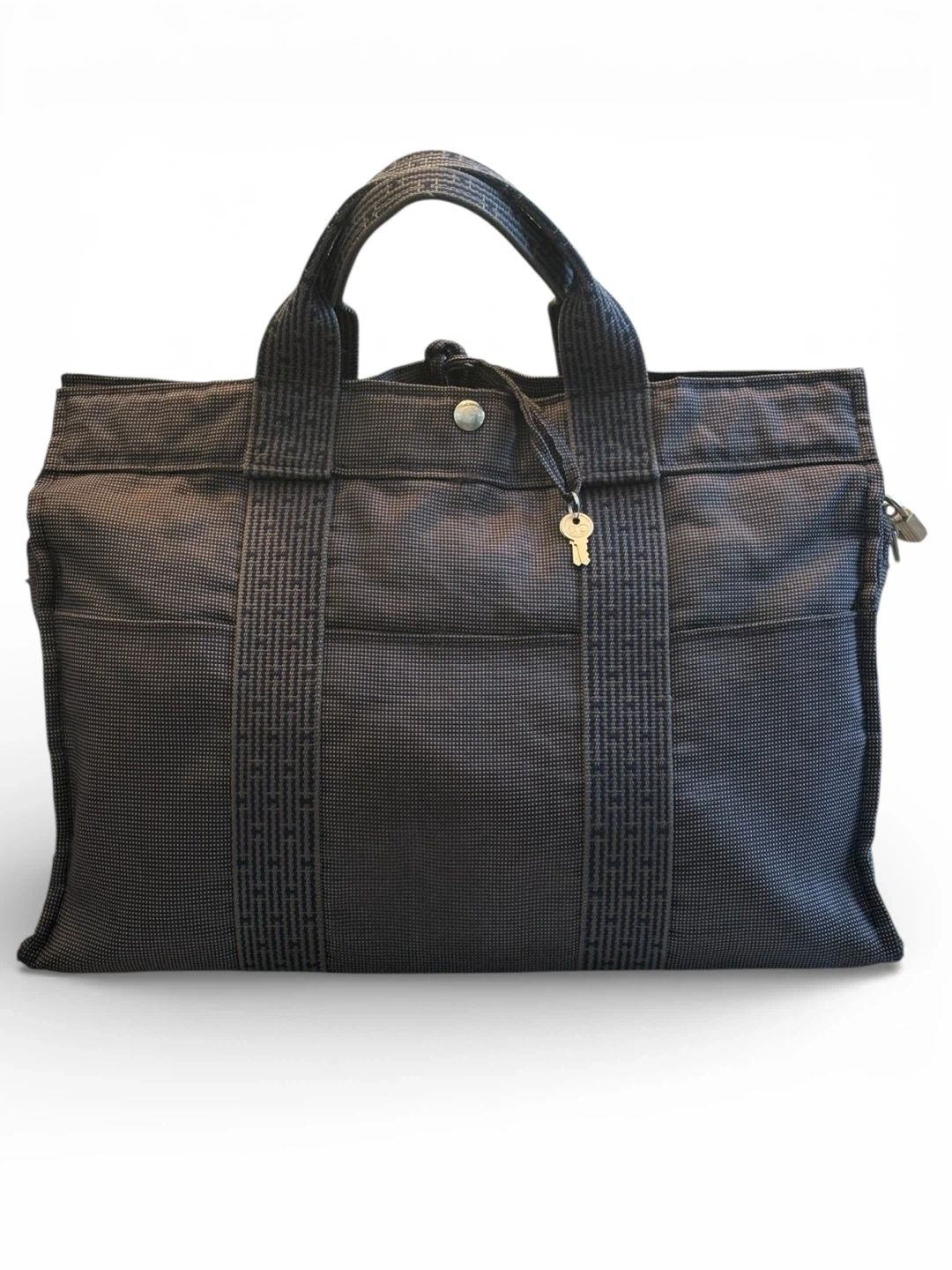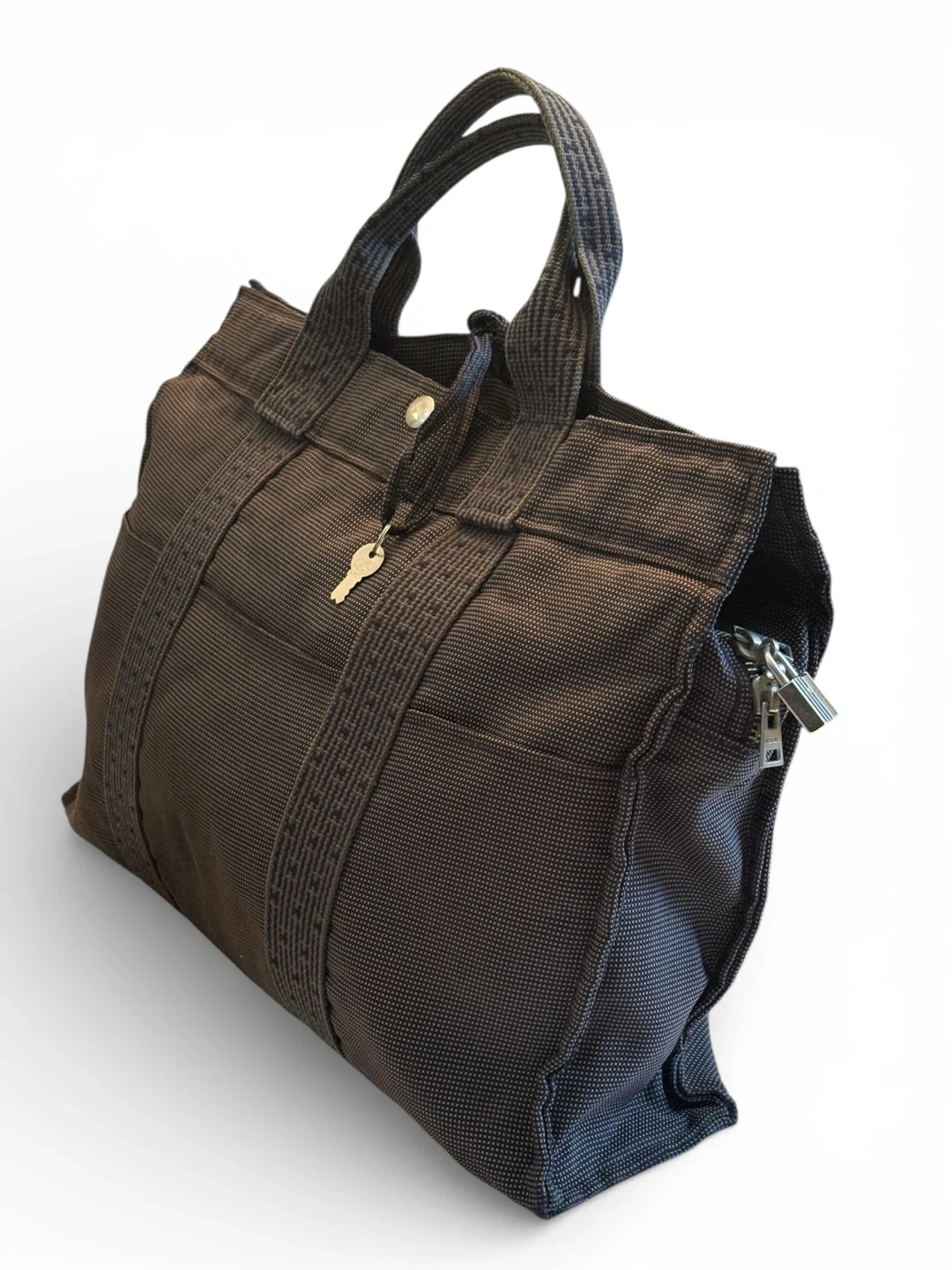Stylish Hermès tote bag made from durable fabric. It features a secure zippered closure with a lock and key set. This bag is perfect for everyday use.