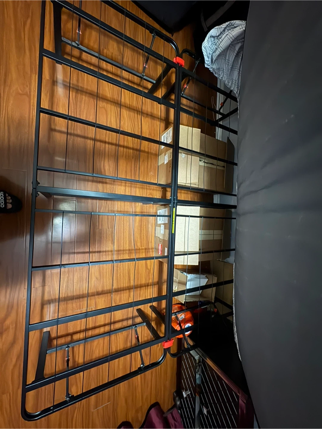 This is a queen size bed frame with an Aloe Vera mattress. The frame is made of sturdy black metal and is easy to assemble. It includes the mattress and frame, ready for your bedroom. Perfect for anyone needing a complete queen bed setup!