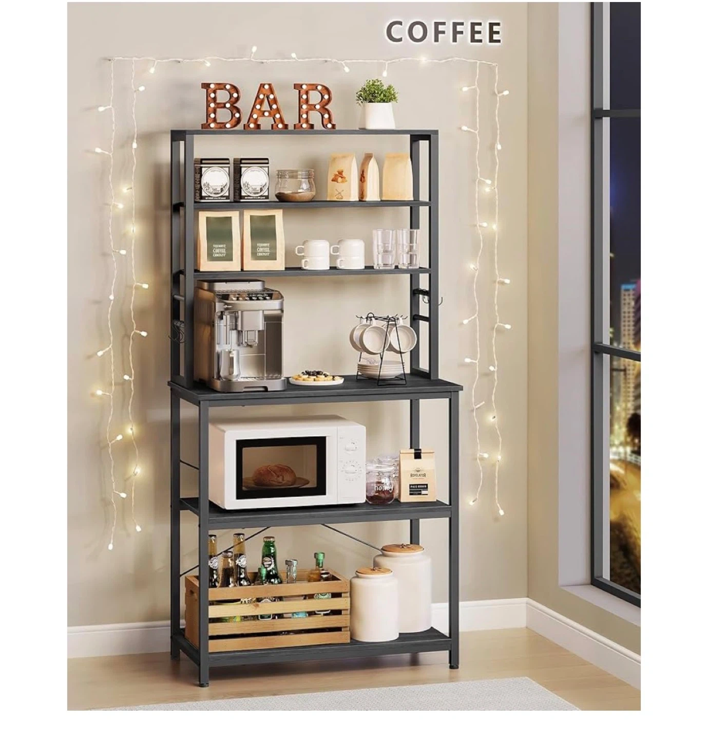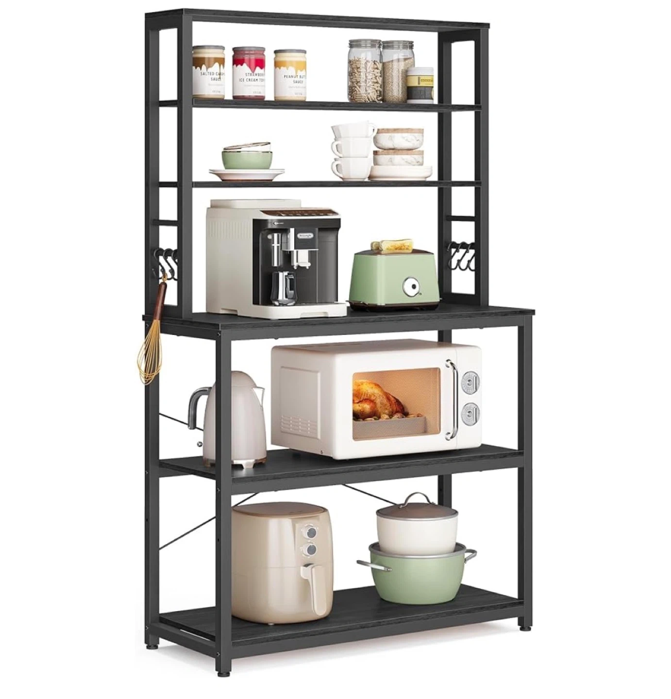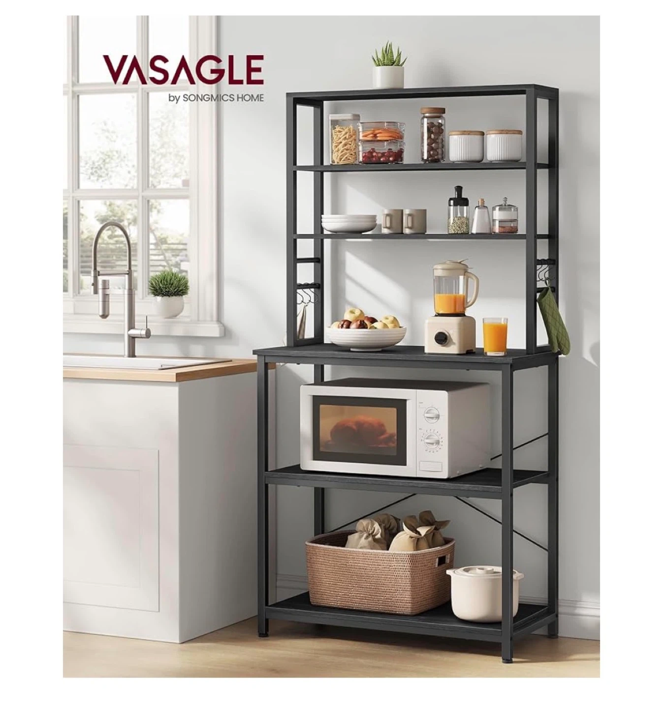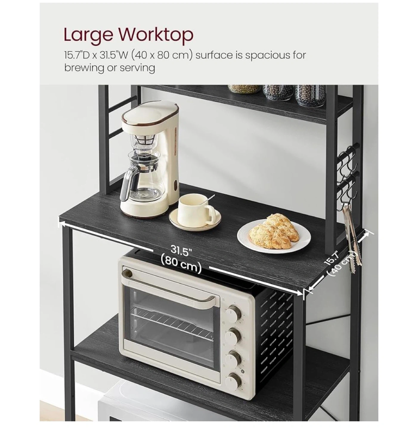 This VASAGLE baker's rack provides ample storage for your kitchen. It features a large worktop with dimensions 31.5" W x 15.7" D, plus multiple shelves. The sturdy metal frame is dark grey.