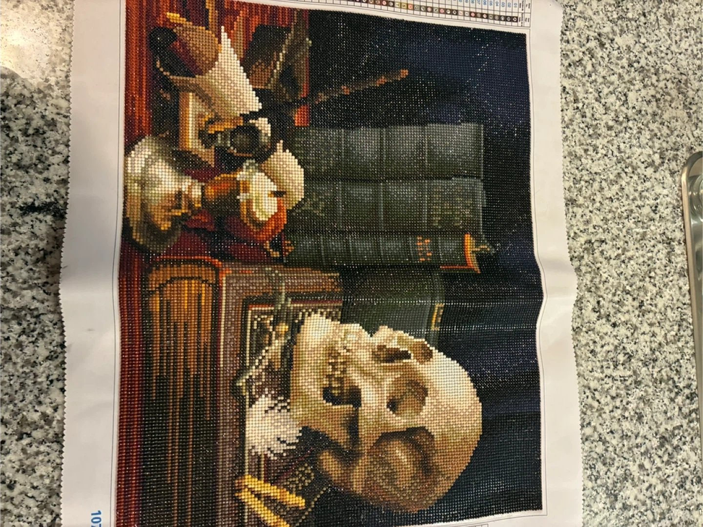 This is a complete diamond painting kit featuring a still life with a skull and books. The canvas is pre-printed with a pattern for easy placement of the rhinestones. It's a fun and relaxing craft project for adults and teens. Not sealed