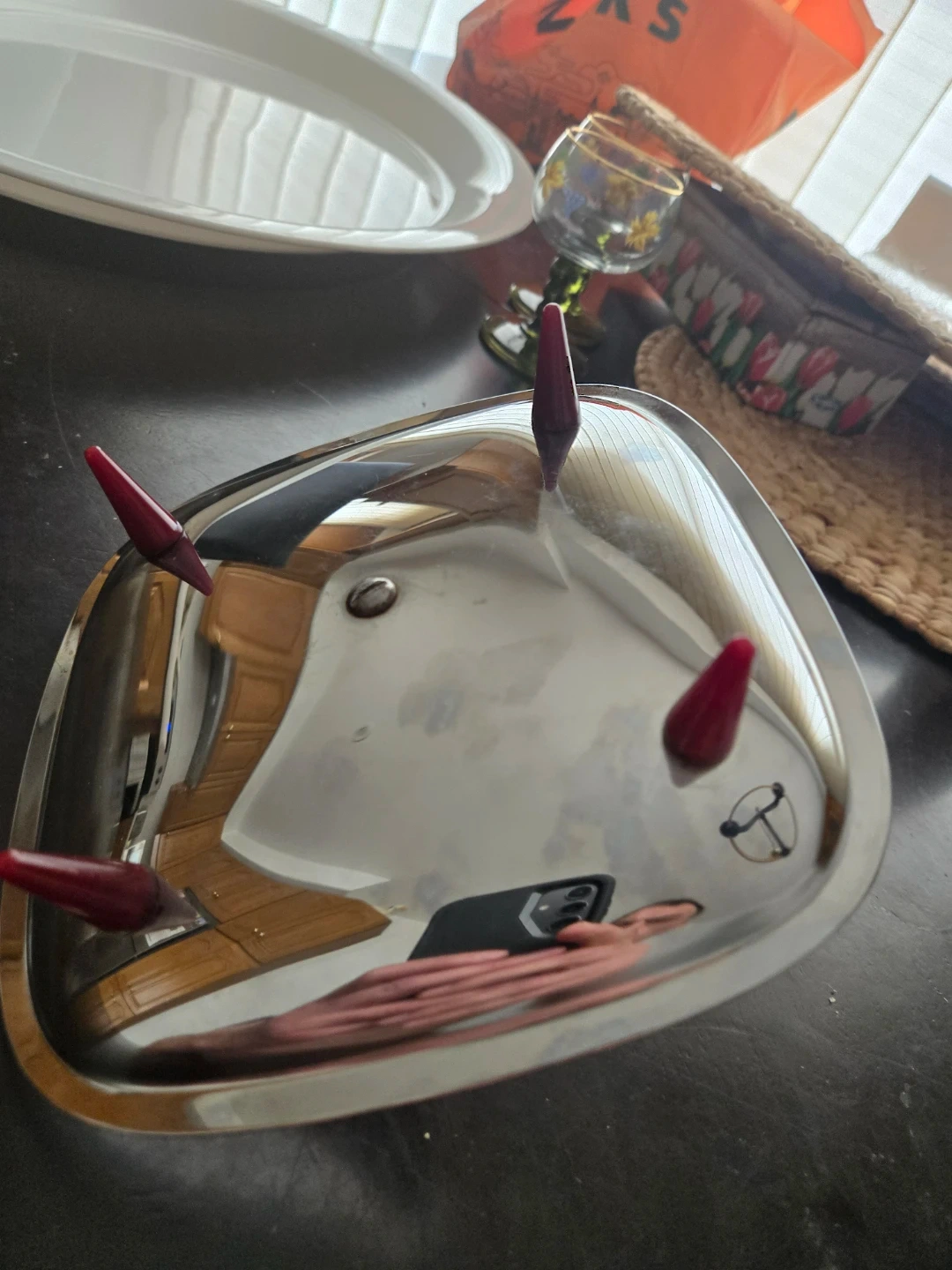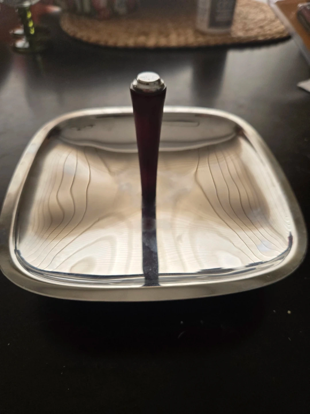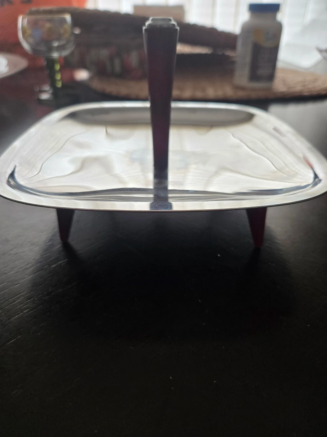 This vintage tray is made of shiny stainless steel with a dark wood handle and four matching tapered legs. It's great for serving appetizers or as a decorative piece. The tray has a polished finish.