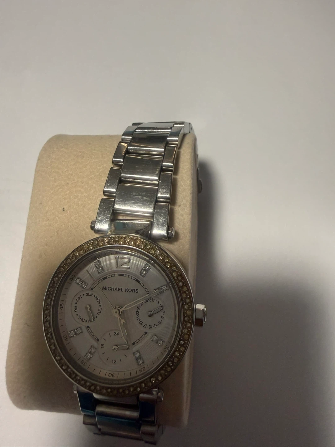 A Michael Kors women's watch with a silver-tone metal band. It features a silver dial with crystal hour markers and a date complication. The watch has a stainless steel case and is water-resistant.