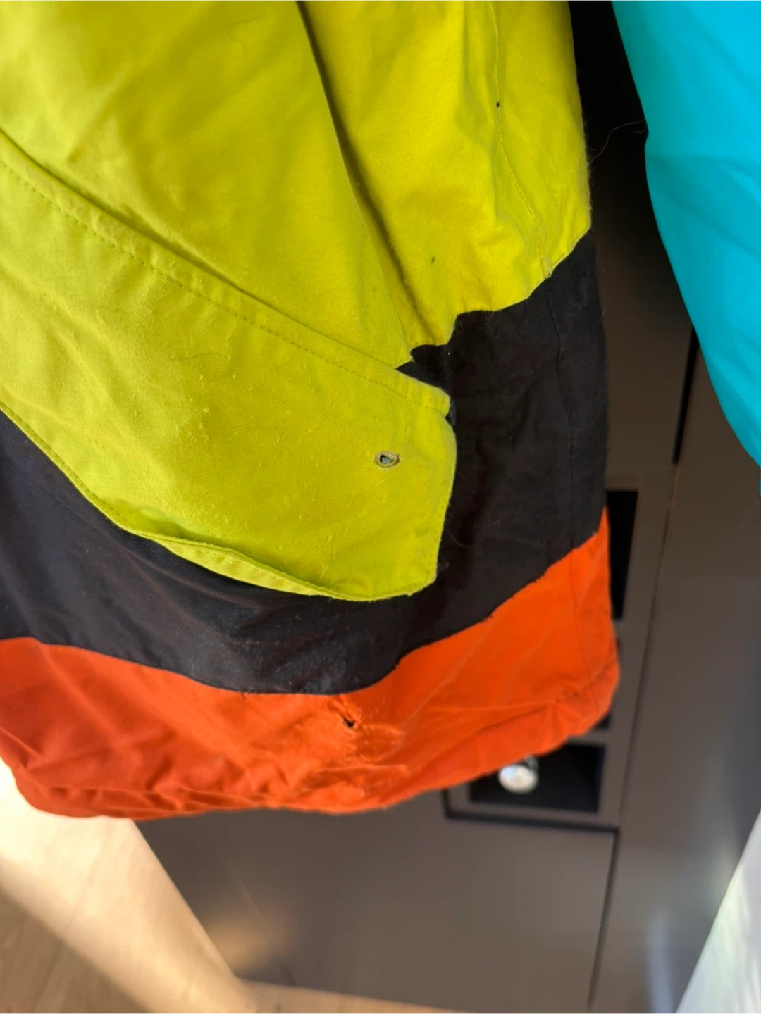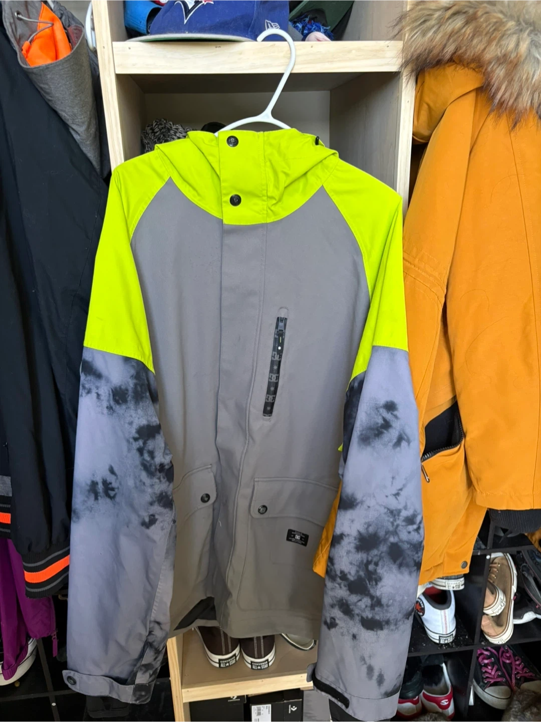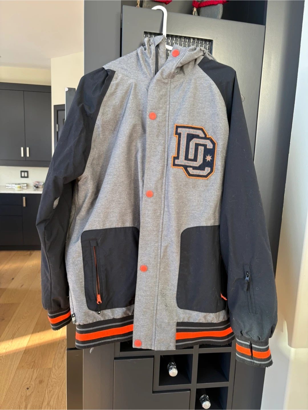 Grey and black DC Shoes snowboard jacket with orange accents. Features a hood and multiple pockets. Perfect for hitting the slopes this season!