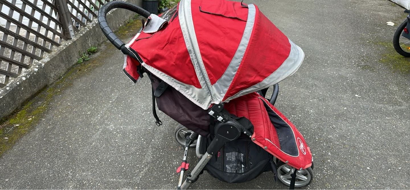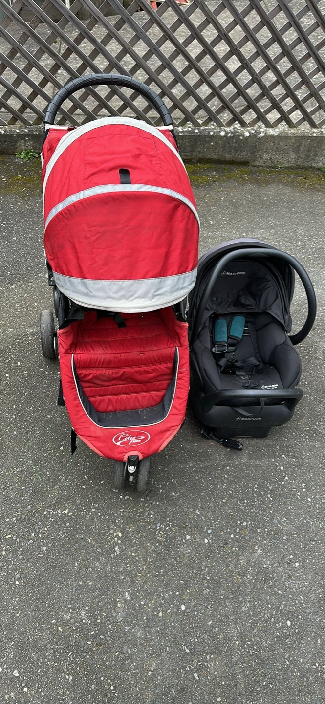 This is a red and black Baby Jogger City Mini stroller. It includes a black Maxi-Cosi infant car seat (Free)(manufactured-June 2018). Great for quick outings!