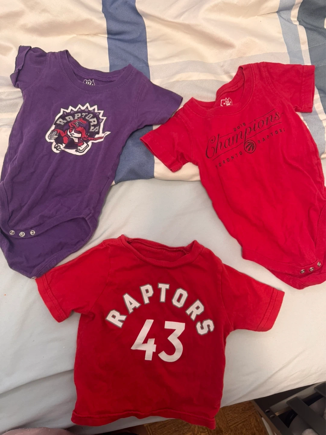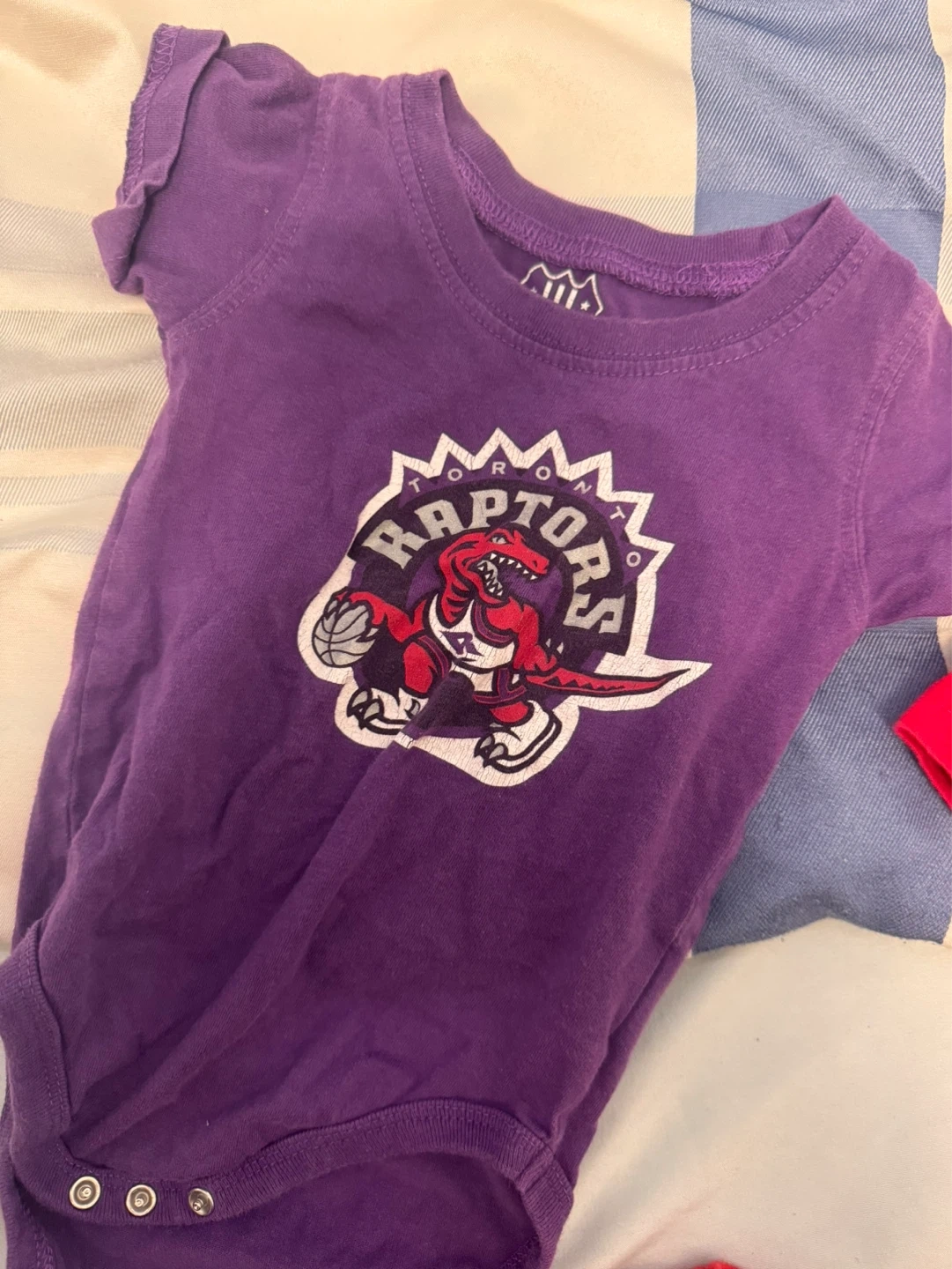 Three Toronto Raptors baby items: a red 'Champions 2019' bodysuit, a purple Raptors logo bodysuit, and a red Raptors jersey-style t-shirt. Cotton blend fabric. $10 each OBO for all 3. Onesies are 6M & the Siakam shirt is 12M