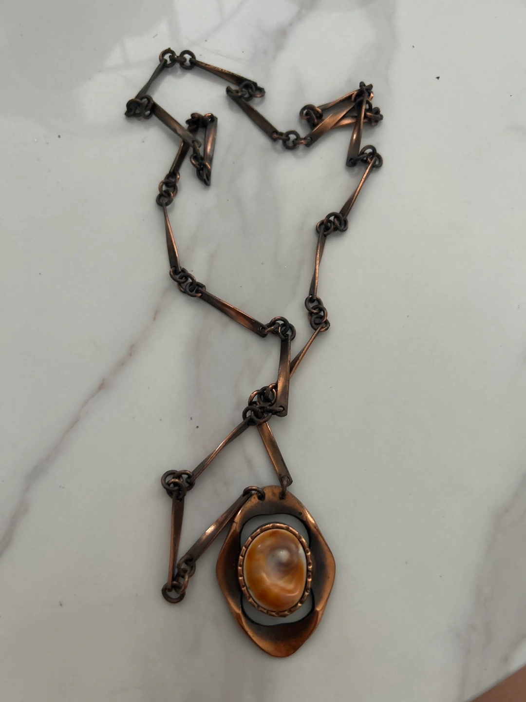 This is a lovely vintage copper necklace featuring a unique shell pendant. It has a beautiful, aged patina that adds to its charm. Perfect for adding a touch of vintage style to any outfit!