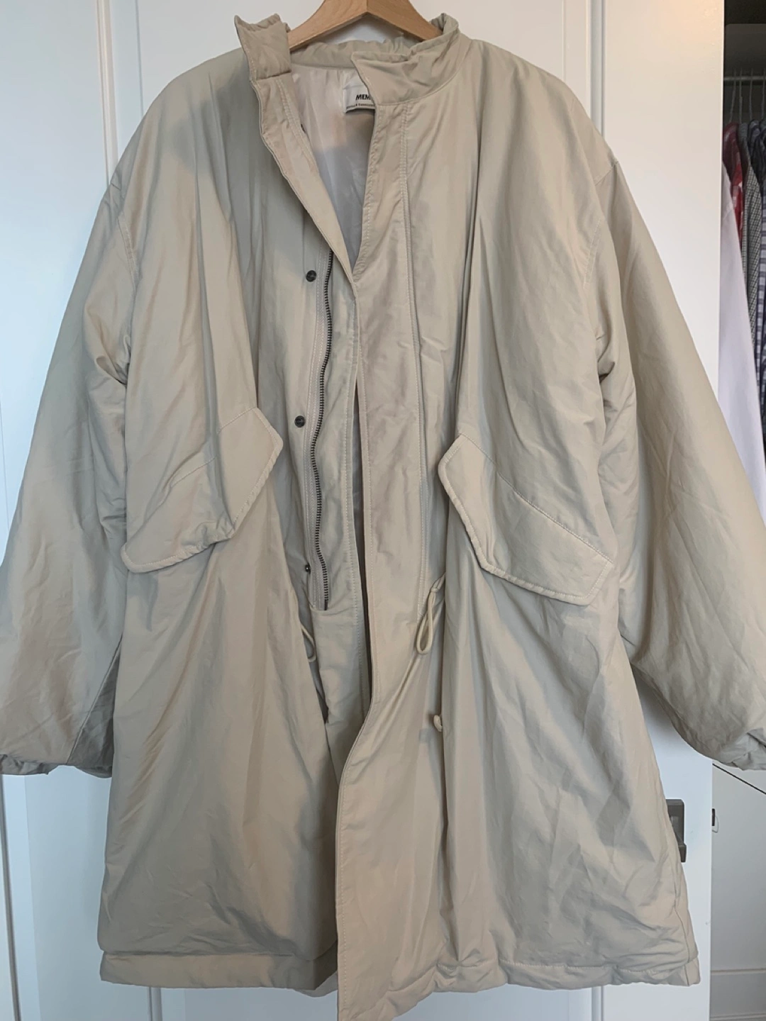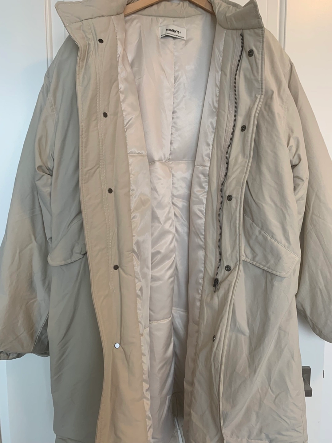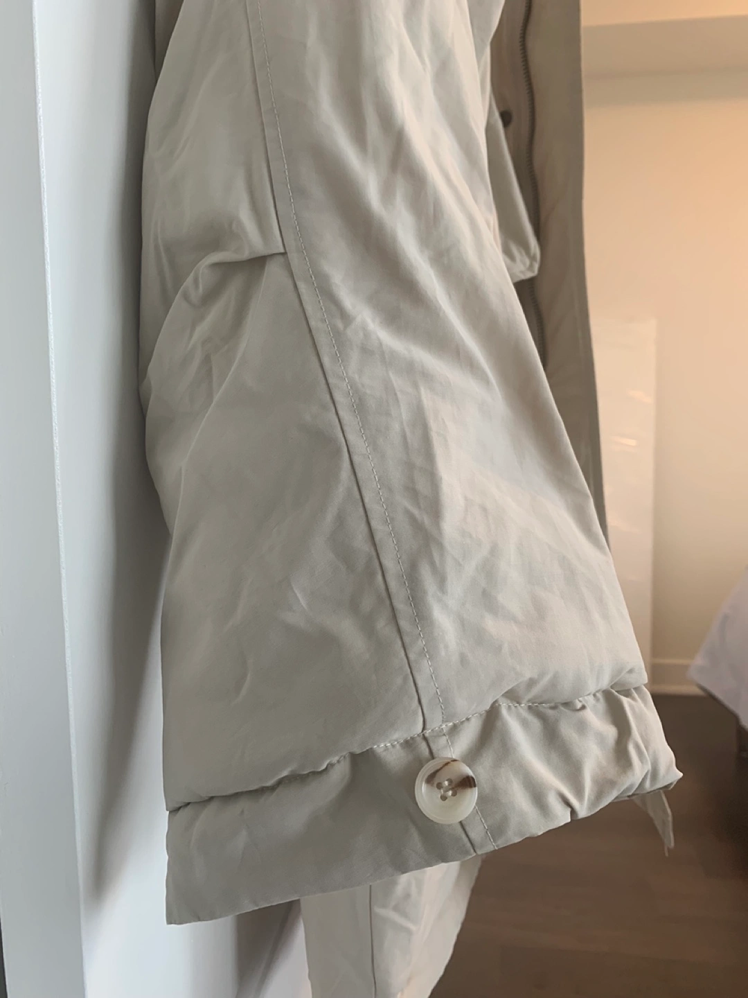 The perfect coat for cold weather. Features a zipper closure, buttons, pockets, and a drawstring in the back. The coat has long sleeves.