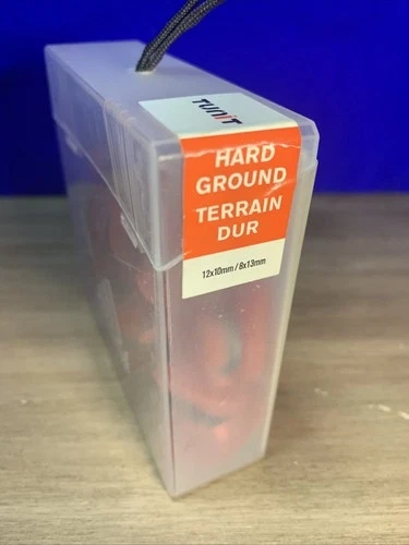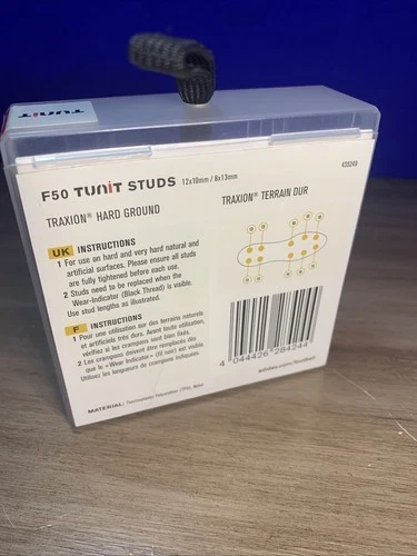 Authentic Adidas F50 TUNIT Traxion® Hard Ground Studs Set, designed for firm and artificial pitches. This kit is brand new and unused, still sealed in its original Adidas hard plastic carrying case with a handle strap. Includes: 12 x 10mm studs, 8 x 13mm studs. Material: Thermoplastic Polyurethane (TPU) & Nylon. Color: Silver with red base rings. Condition: 100% Brand New – Never Used. Engineered for hard and very hard natural or artificial surfaces. Wear Indicator (Black Thread) shows when studs need replacement. Designed for maximum stability, grip, and comfort. Compatible with 6- or 8-stud configurations. Durable TPU and nylon materials. Compact and stylish storage case.