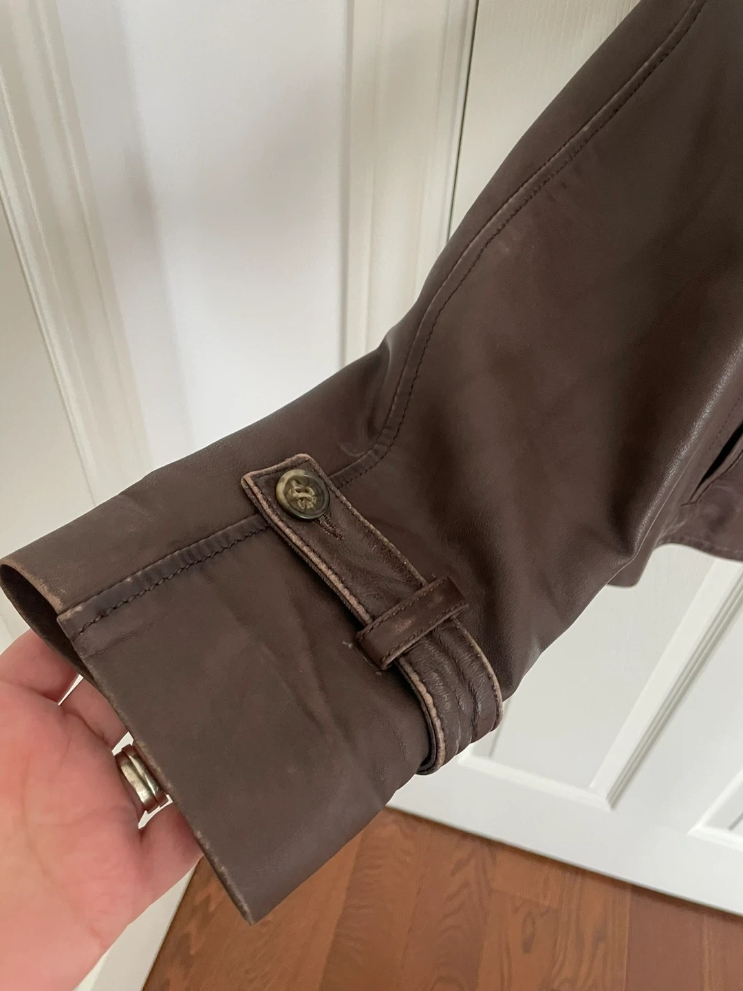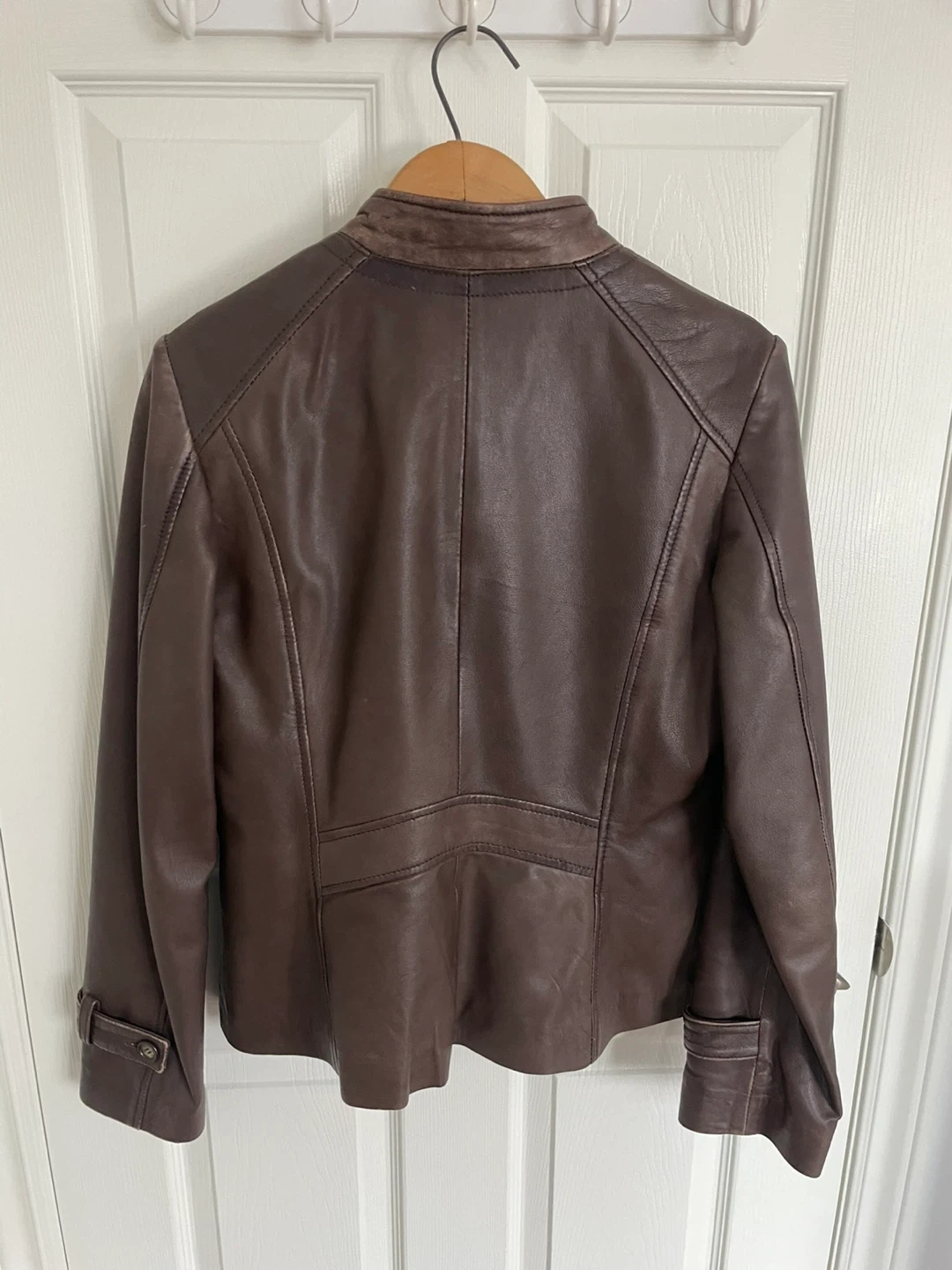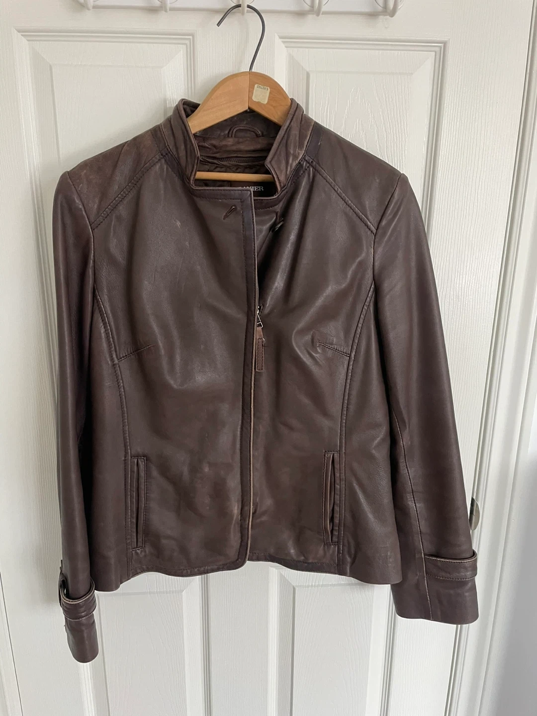 Brown leather jacket from Danier. Features a zip-up front and button detailing on the cuffs. This jacket is sized S/P, UK 12, FR 40, and IT 42. It's a stylish piece for cooler weather!