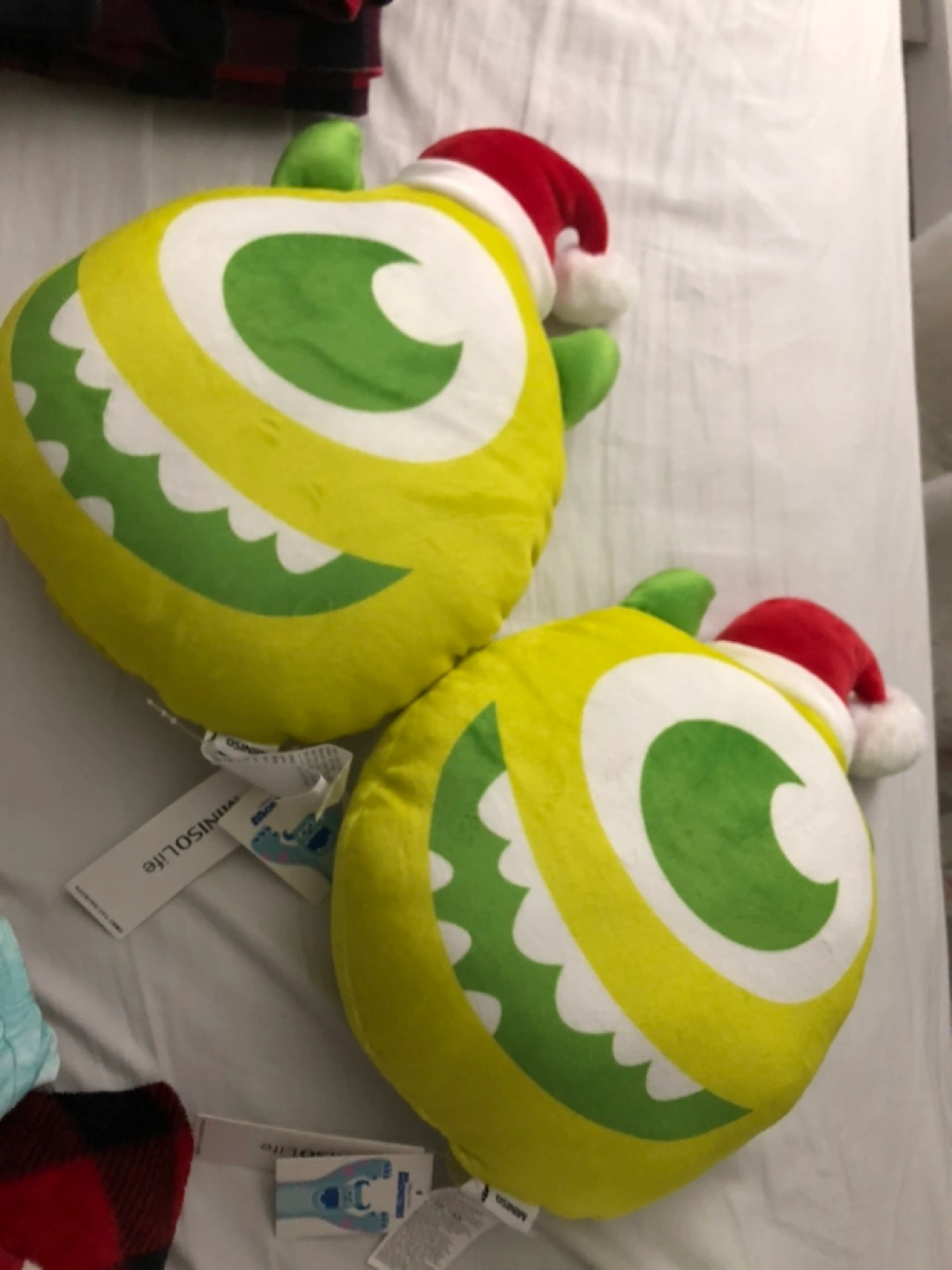 Here is a set of two plush pillows. They are Mike Wazowski, and brand new with tags from Miniso. Each pillow has a Santa hat. They would make a great item to add to your comfort after a long day, or to gift for giggles. Retails for around $13, selling for $5, or both for $8!