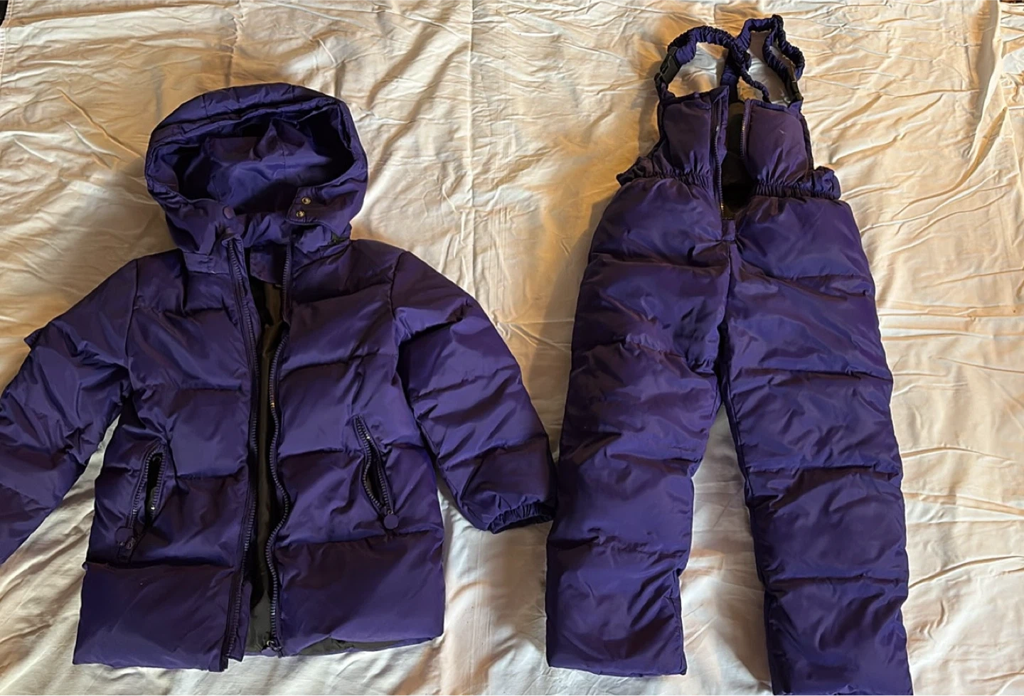 This is a purple puffer snowsuit for kids. It includes a hooded jacket and insulated overalls. Keep your little ones warm and dry during winter play!
