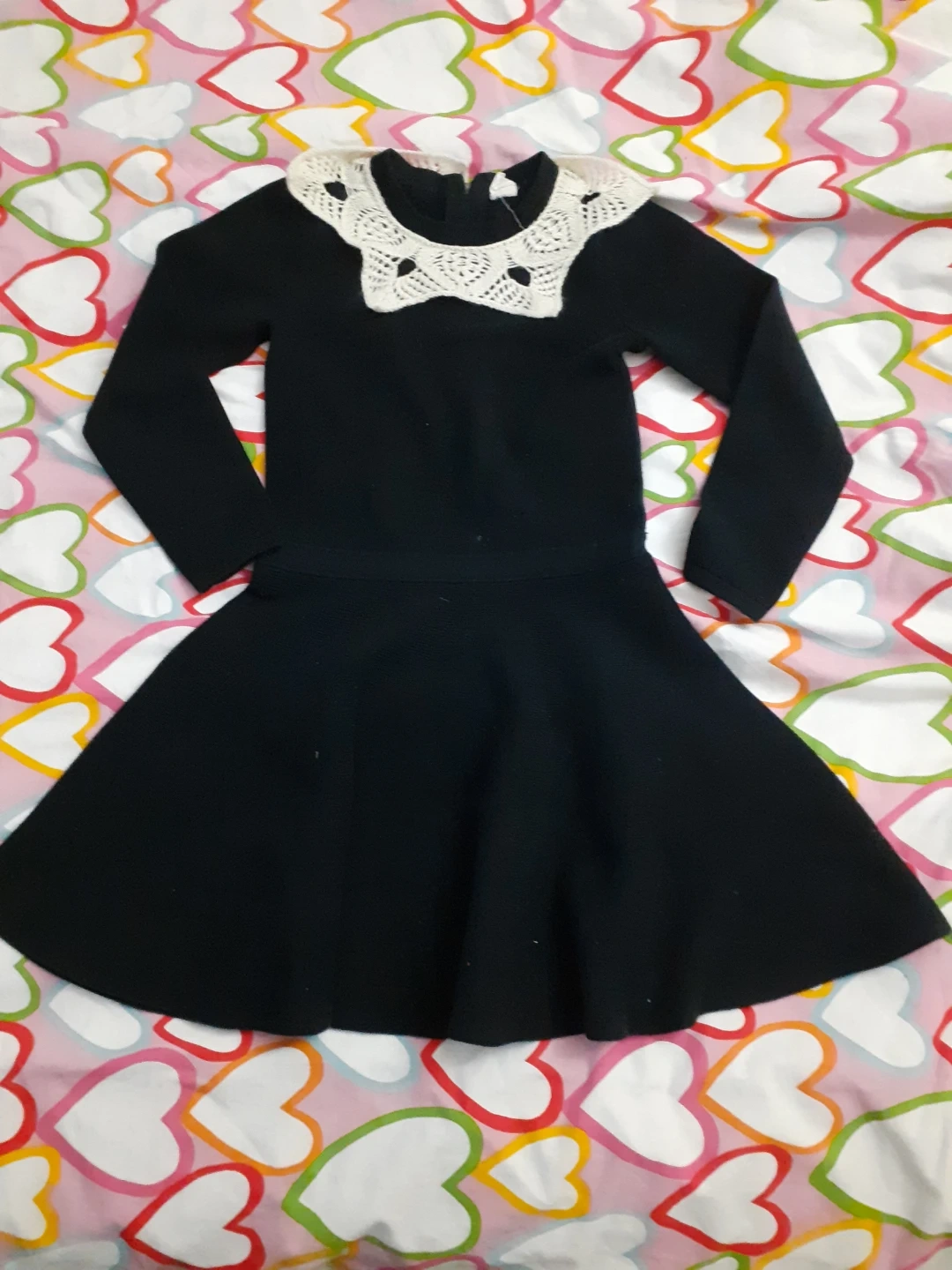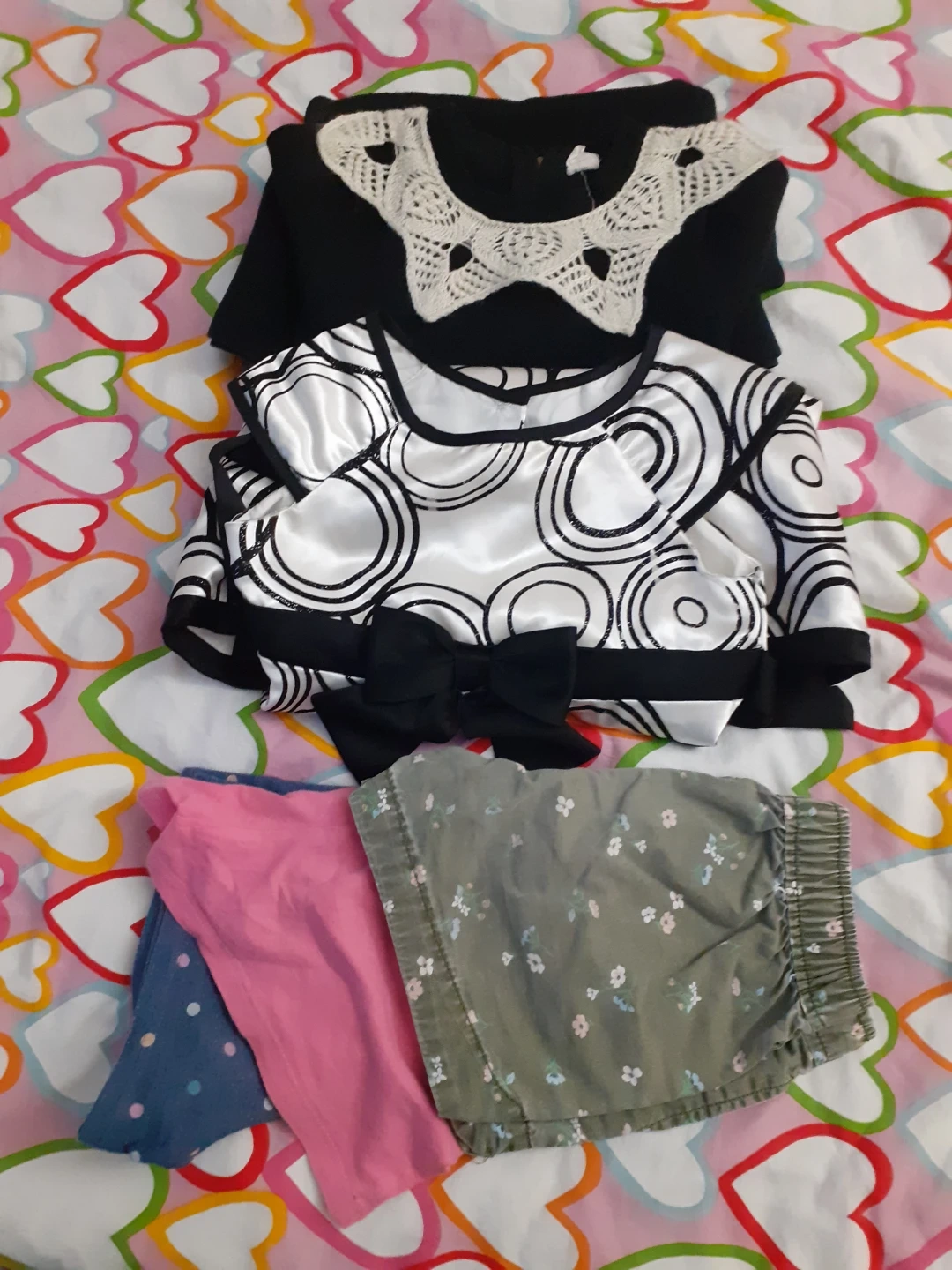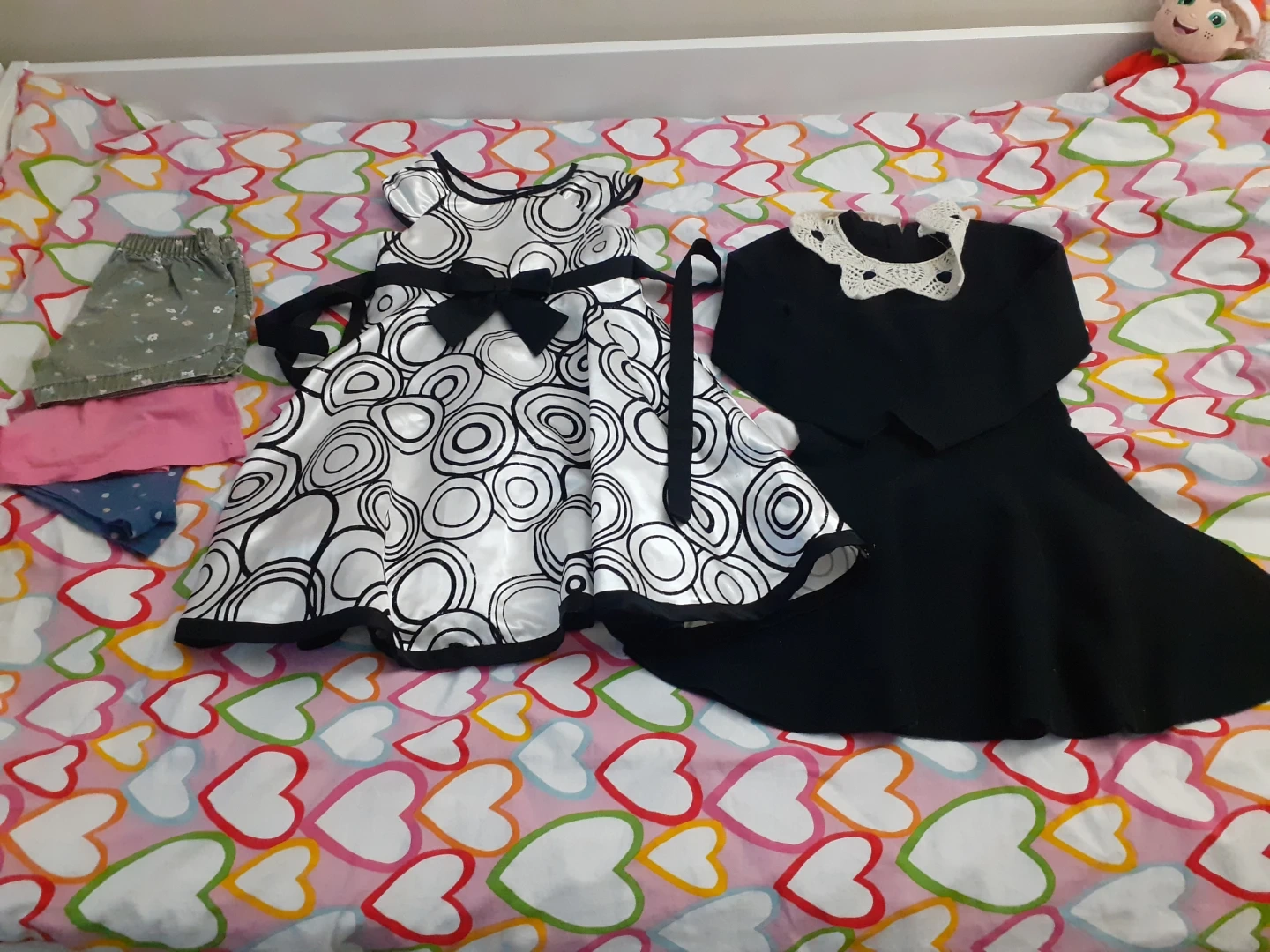 A collection of girls' clothing including two dresses and a pair of shorts. One dress is black with a lace collar, and the other is white with a black swirl pattern and a bow.