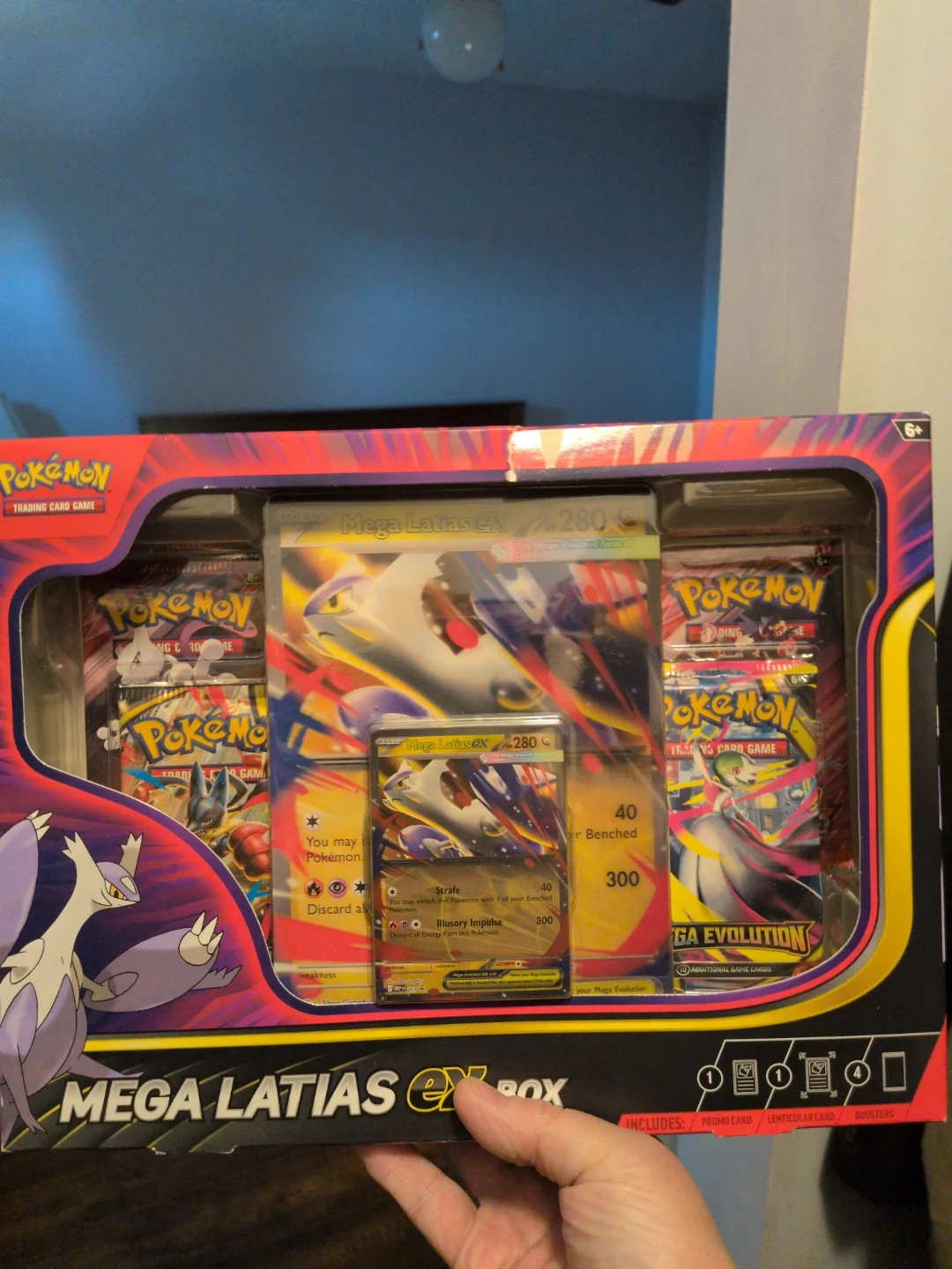 This is the Mega Latias EX Box for the Pokemon Trading Card Game. It includes a promo card and a lenticular card. The box also contains booster packs for the game.