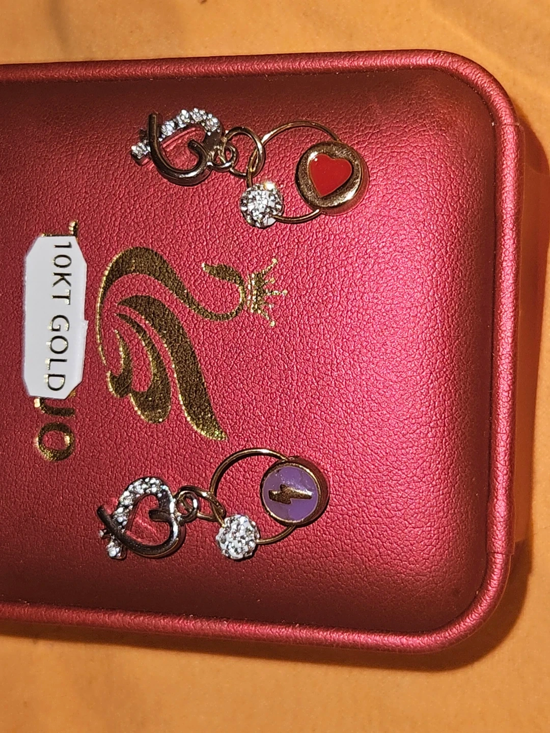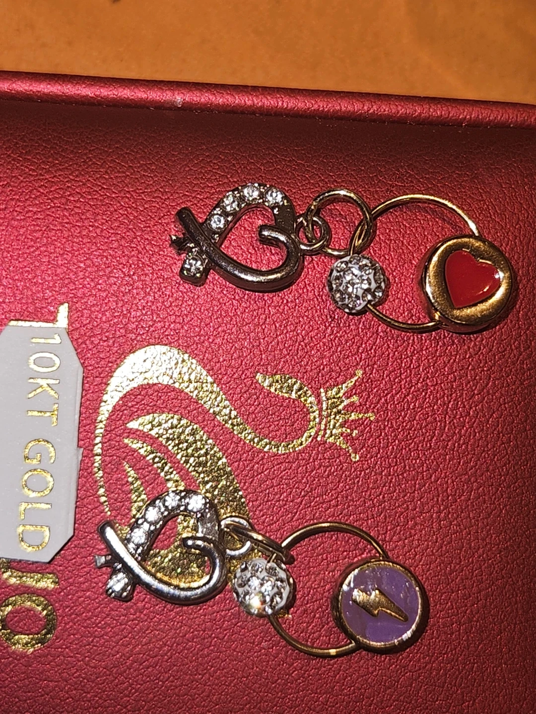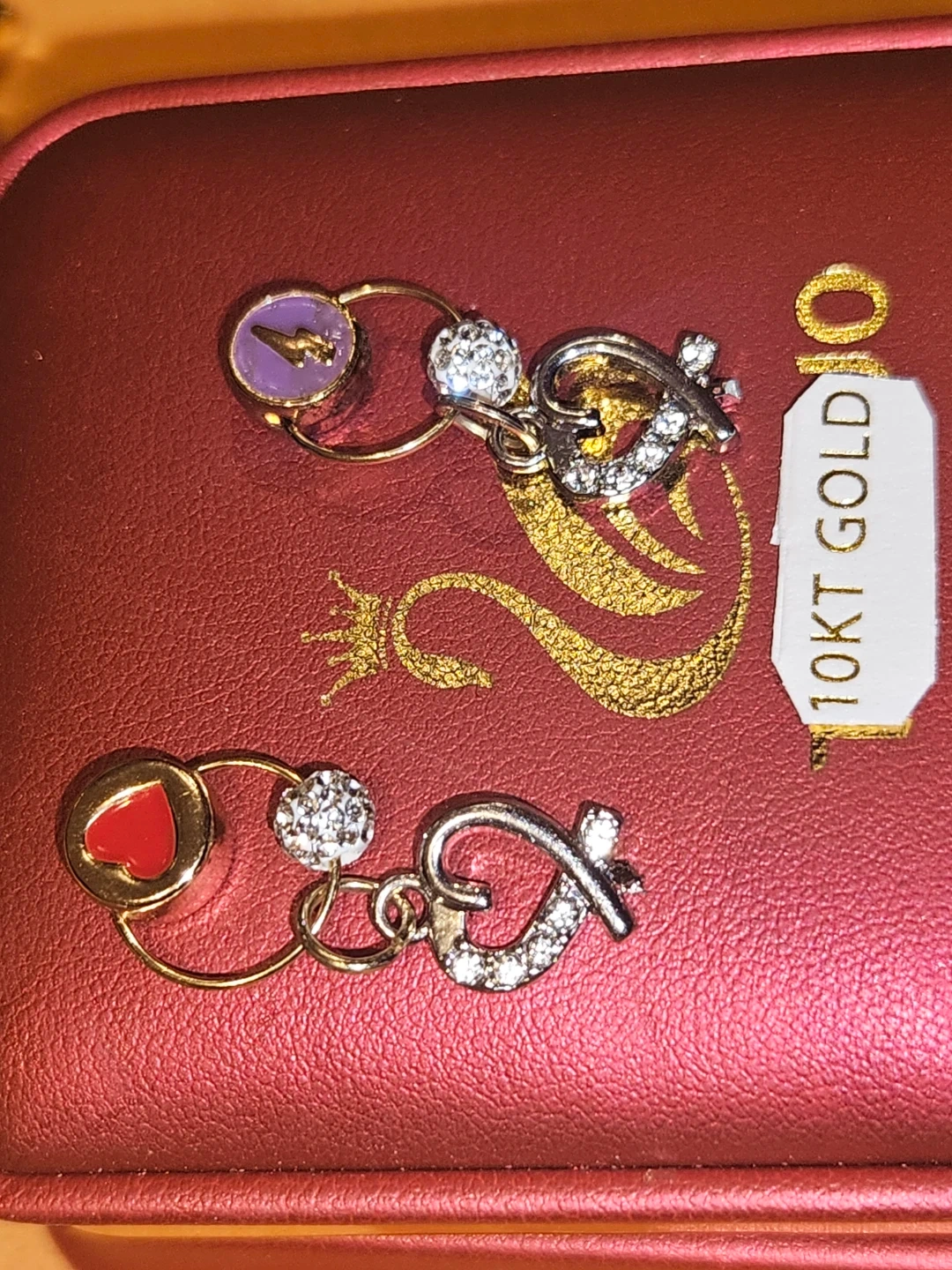 Selling a pair of adorable charm earrings. They are made of 10KT gold and feature cute heart and circle charms. Perfect for adding a touch of sparkle to any outfit! With customized decorative pendants. And a cluster of round Cubic Zirconia.