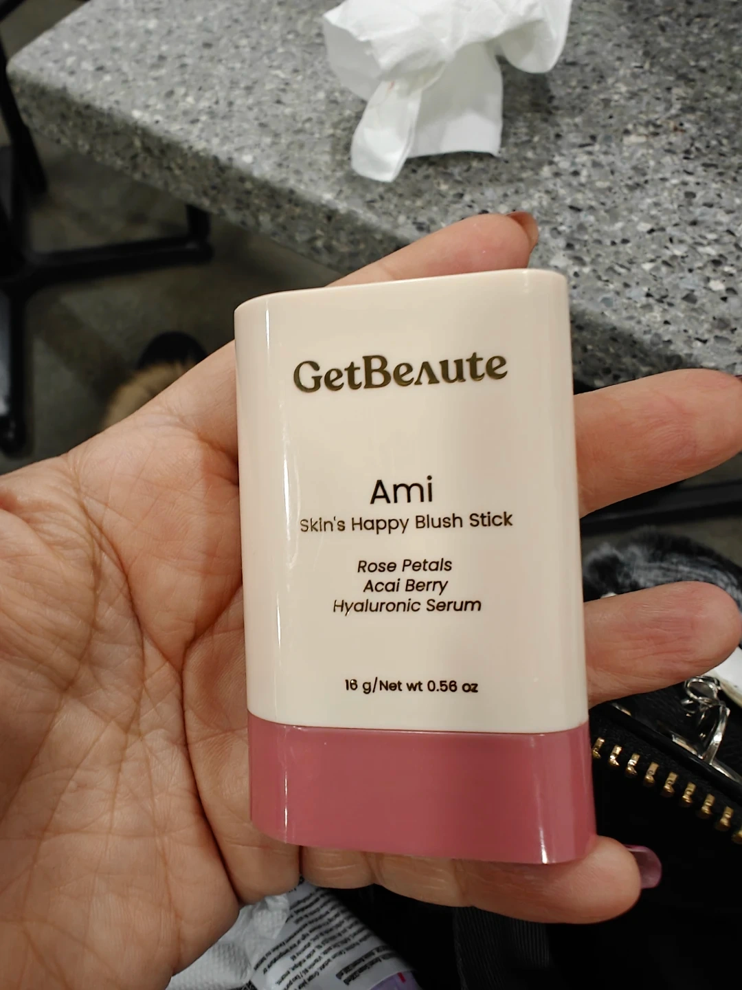 This GetBeaute blush stick is in the shade Ami. It's formulated with rose petals, acai berry, and hyaluronic serum. Contains 18 g/Net wt 0.56 oz. This blush stick would be useful for anyone looking for a natural flush.