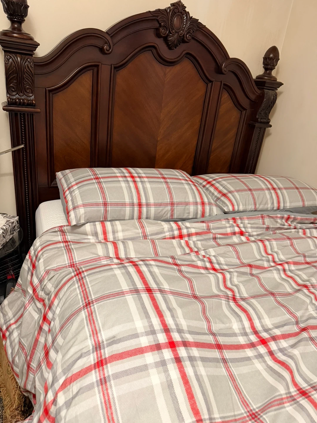 A stylish dark wood bedroom furniture set featuring a headboard, dresser with mirror, and a nightstand. It's made of rich, dark wood with ornate detailing. This set includes a matching bedding set with a plaid pattern. The dresser has ample drawer space for storage.