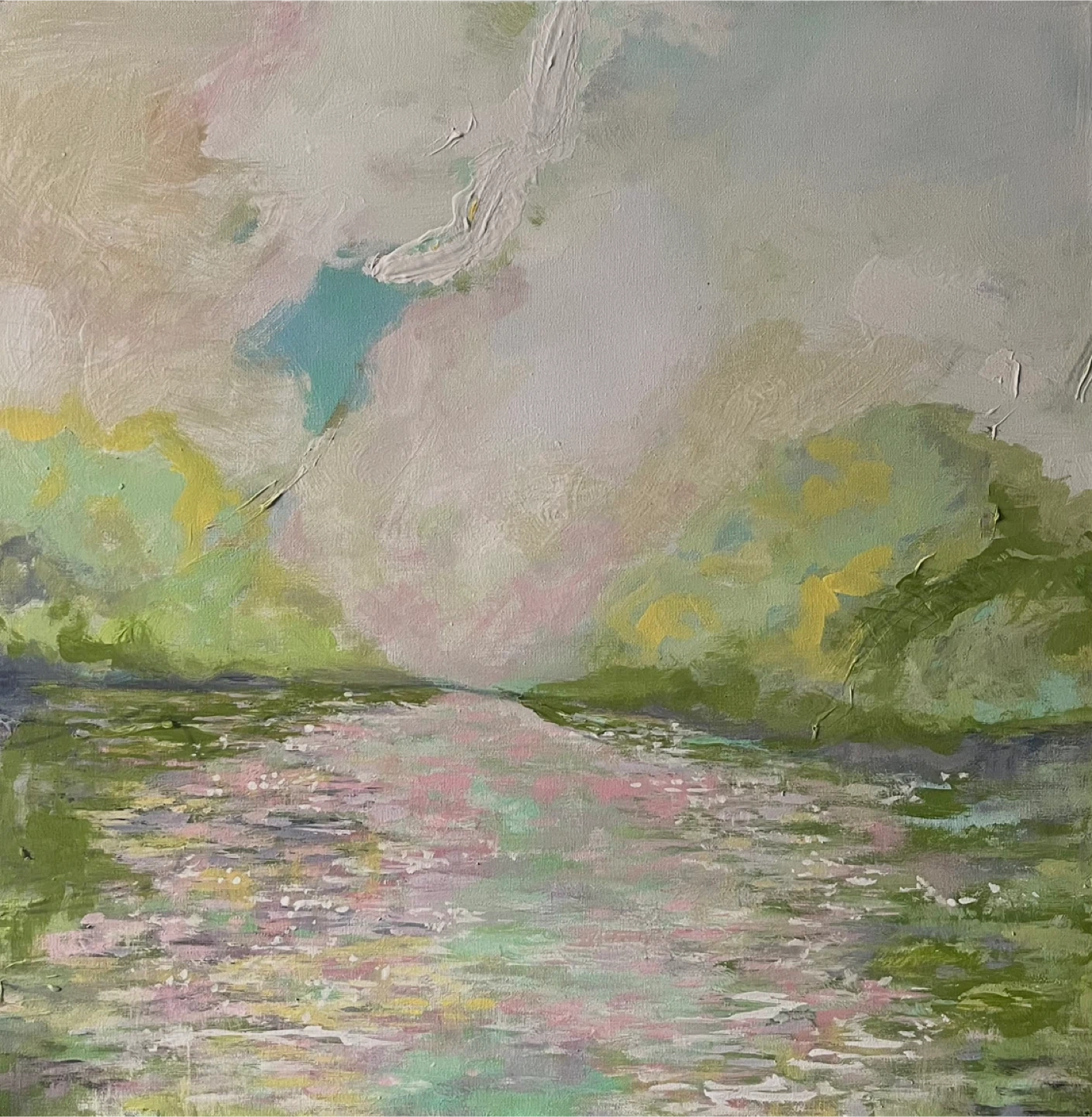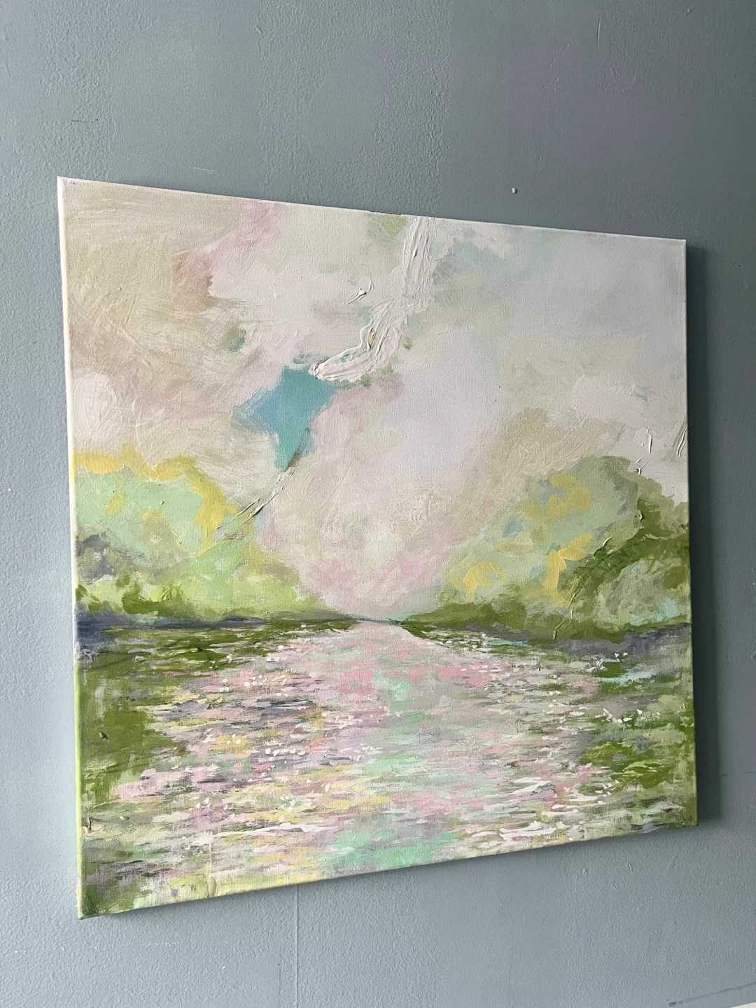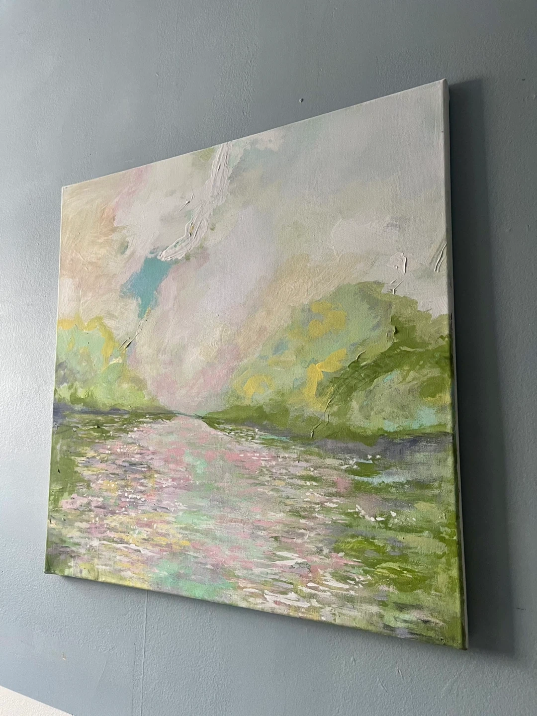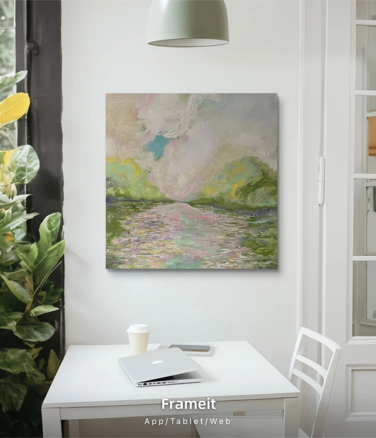 Canvas print featuring an abstract landscape with soft colours. The painting depicts a serene water scene with muted greens, pinks, and yellows. It's a lovely piece that adds a calming atmosphere to any room. Ready to hang art for your living space.
