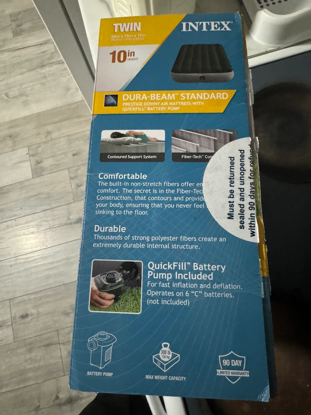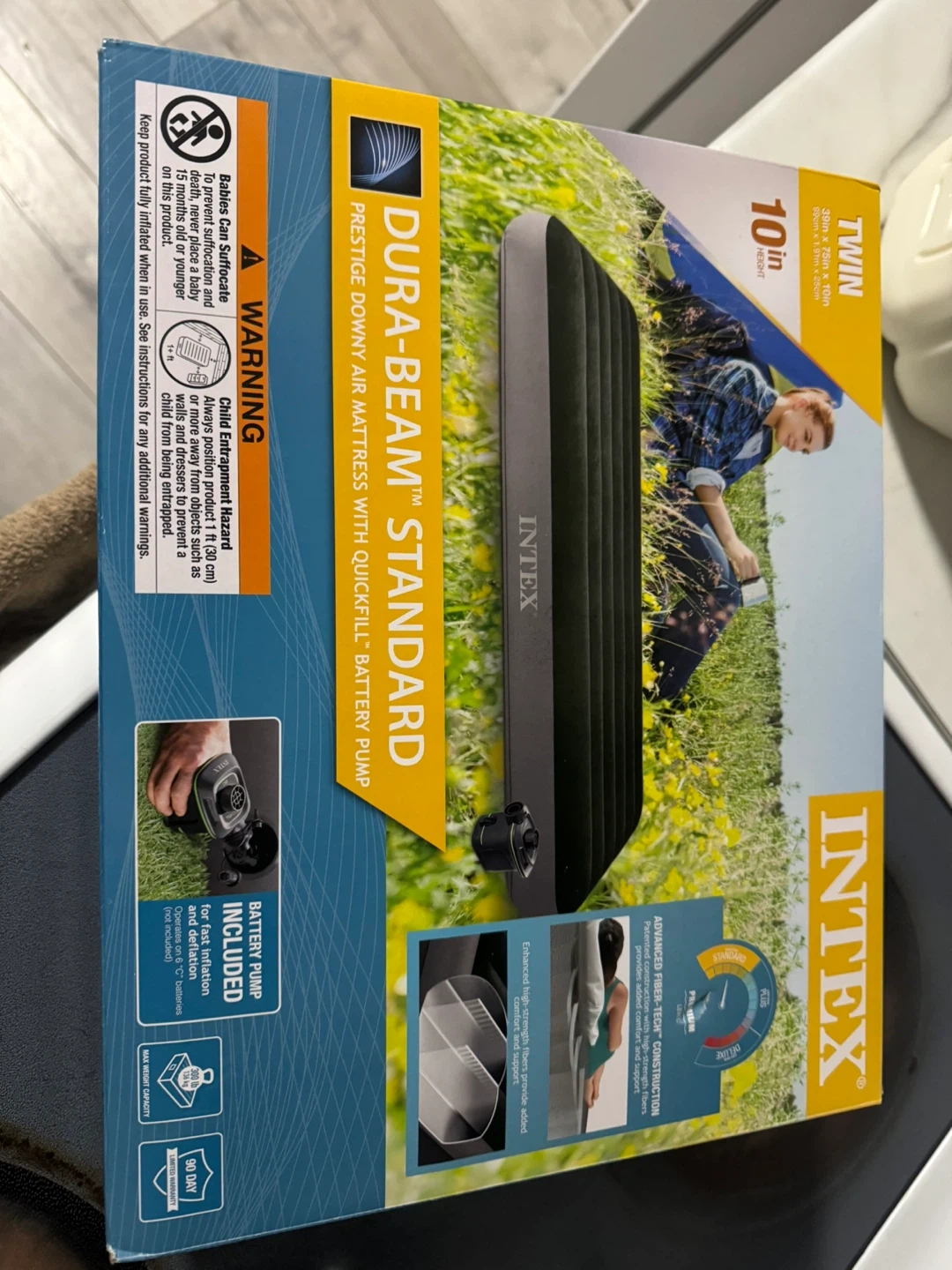 This INTEX Dura-Beam Standard air mattress is a twin size, measuring 39in x 75in x 10in. It features Fiber-Tech construction and comes with a built-in quickfill battery pump. The mattress offers contoured support for enhanced comfort. Perfect for camping or overnight guests! New one