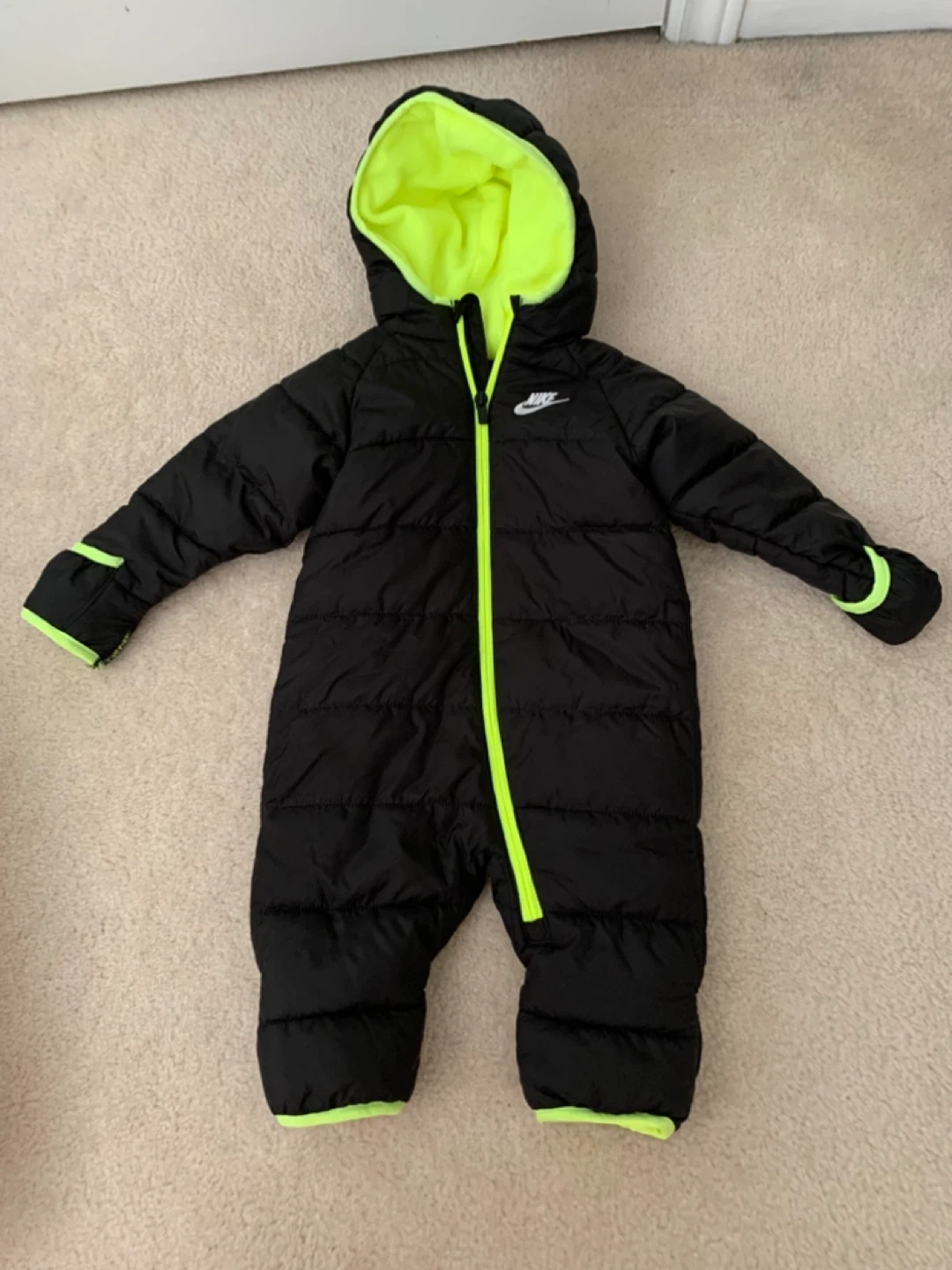 Keep your little one warm in this adorable Nike baby snowsuit! It's in excellent condition and features a stylish black exterior with a bright neon yellow lining and zipper.