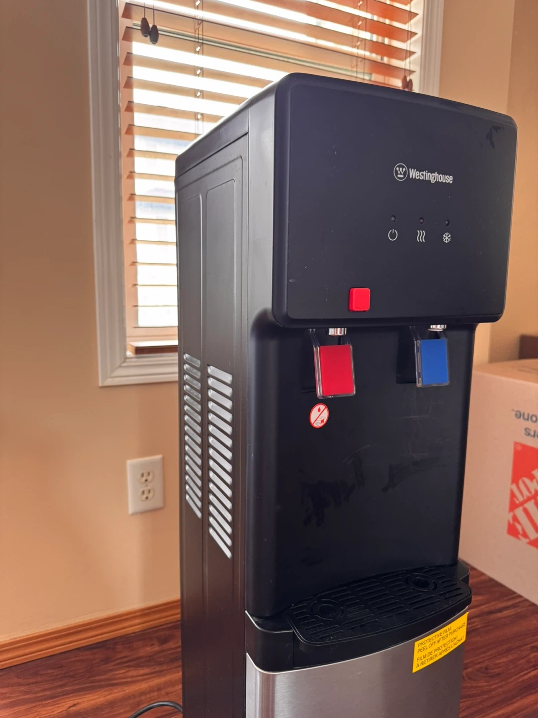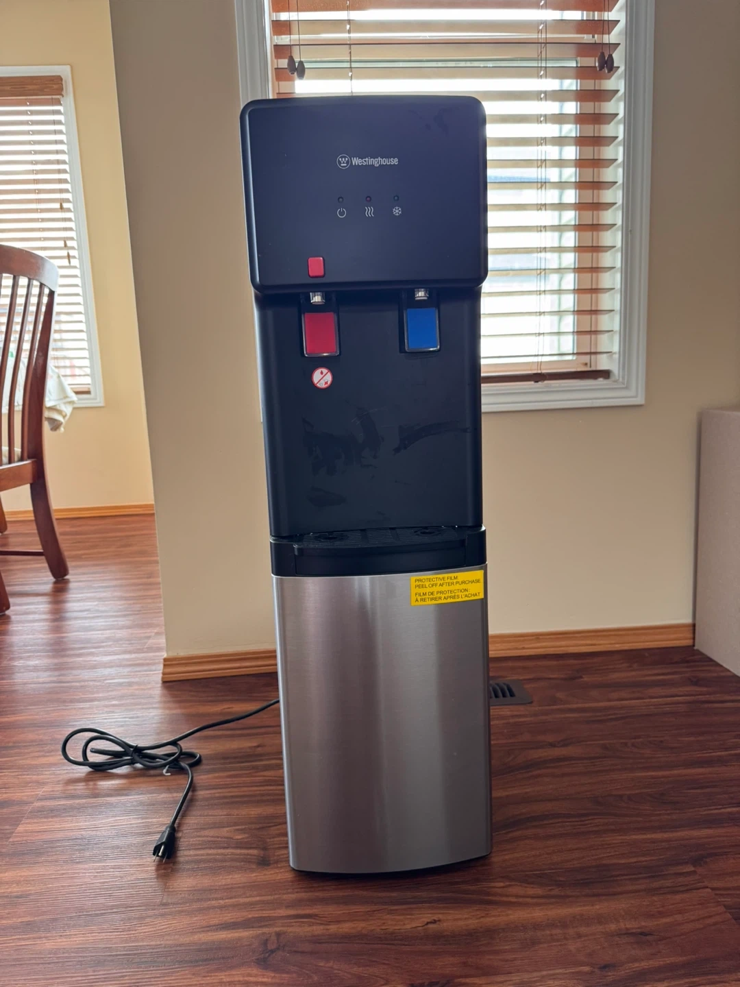 This Westinghouse water cooler dispenser offers both hot and cold water options. It features a sleek black and stainless steel design, making it a practical addition to any home or office. The dispenser has indicator lights for power, heating, and cooling.It never been used electrically(for hot water boiling).