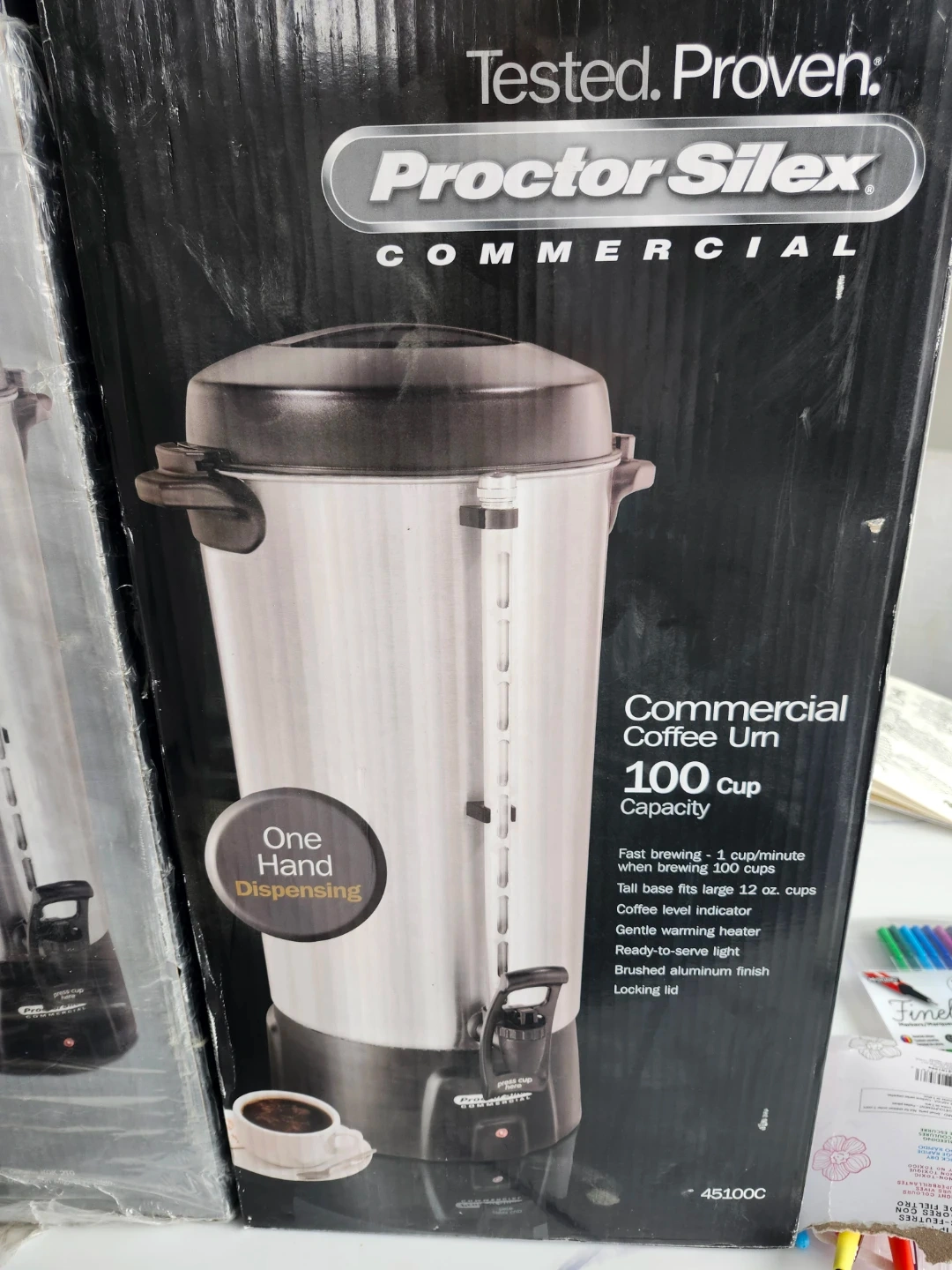 Never used Proctor Silex 100-cup commercial coffee urn. Features a stainless steel brushed aluminum finish with a locking lid and cool-touch handles. It's great for serving hot beverages quickly, brewing up to 4 cups per minute. Purchased for $423.00