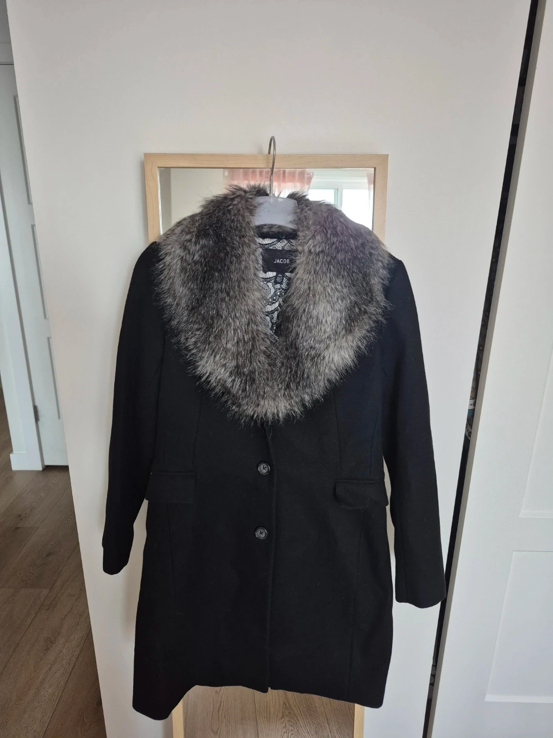 Like-new women’s wool-blend coat by Jacob, size S. Elegant and warm, with a detachable fur collar so you can switch up the look. Only worn a couple of times and professionally dry cleaned after the last use. In excellent condition and ready for a new home.