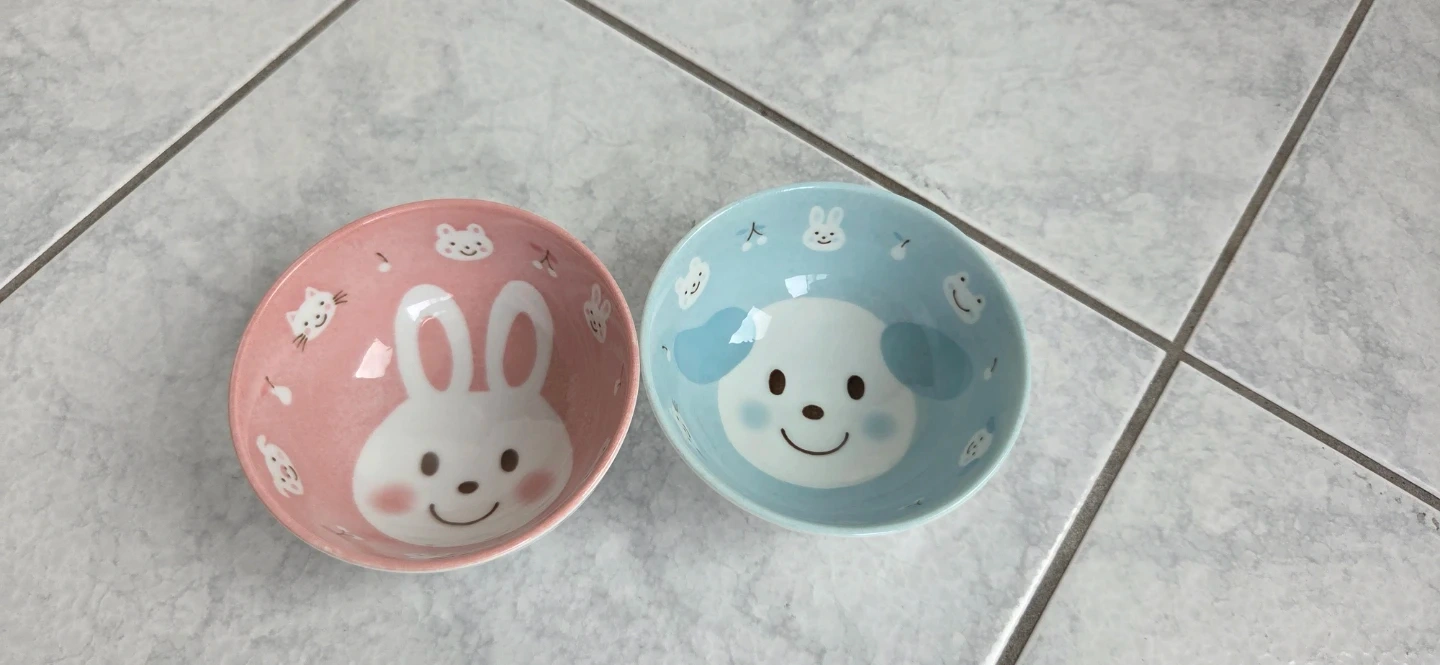 This set includes a pink bowl with a bunny design and a blue bowl with a puppy design. They're perfect for serving snacks or small meals to kids!
