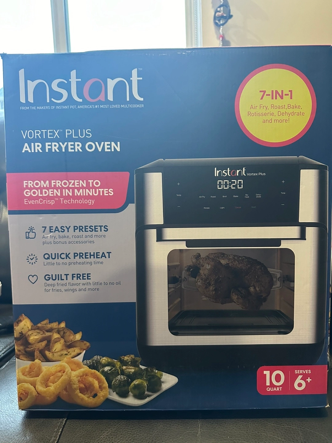 7-in-1 air fryer oven. Air fry, roast, bake, broil, reheat, and dehydrate. EvenCrisp technology. Quick preheat. 10-quart capacity. Serves 6+. Includes accessories.