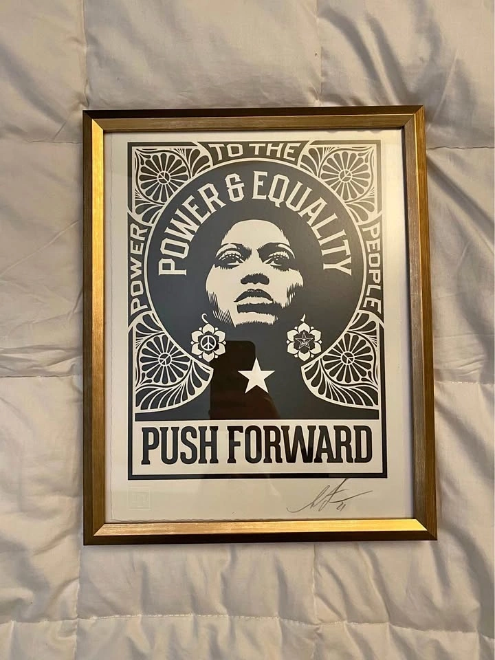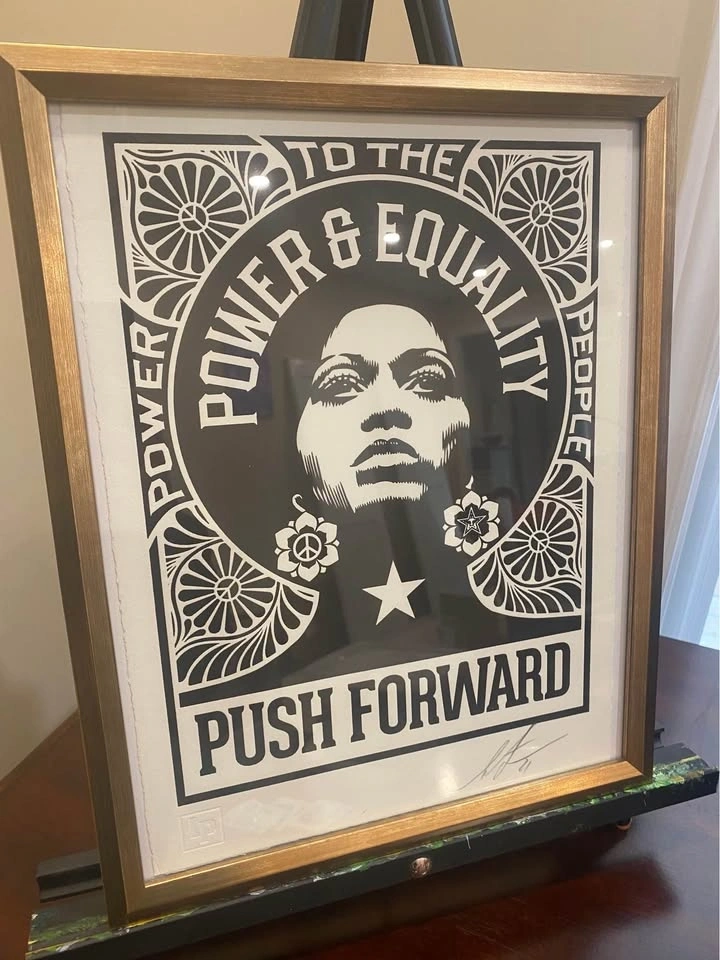 Authentic Shepard Fairey (Obey) “Power & Equality / Push Forward” print, framed in a gold frame.