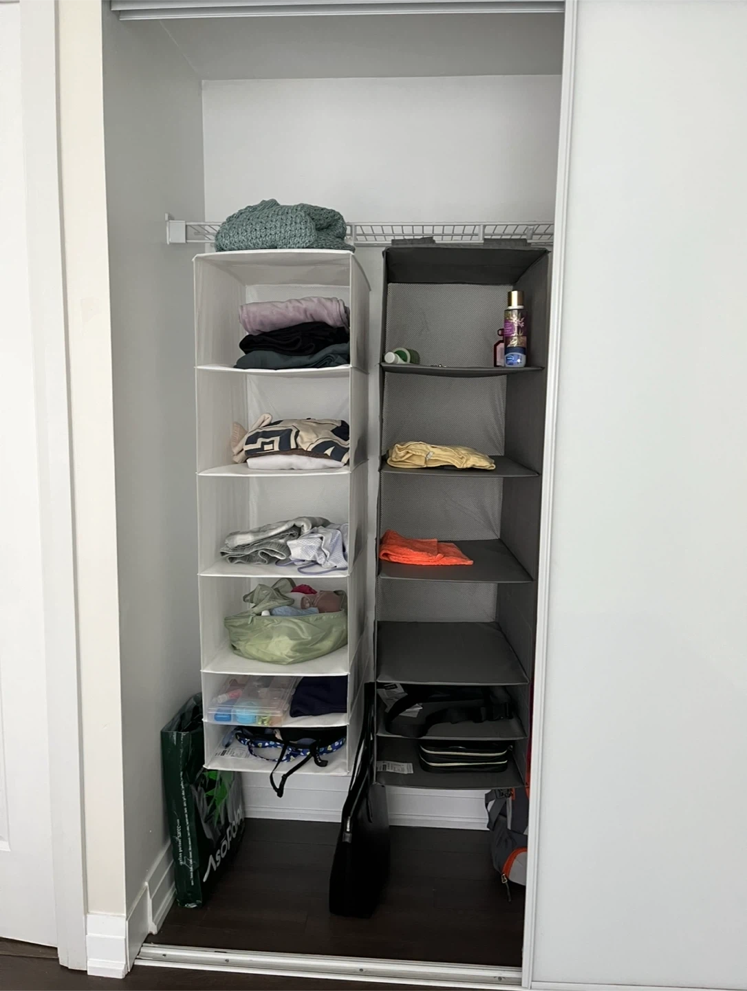 • White and grey hanging fabric organizer with multiple shelves. Great for closets or wardrobes to organize clothes, towels, accessories, or pantry items. Lightweight, space-saving, and easy to hang. -$10