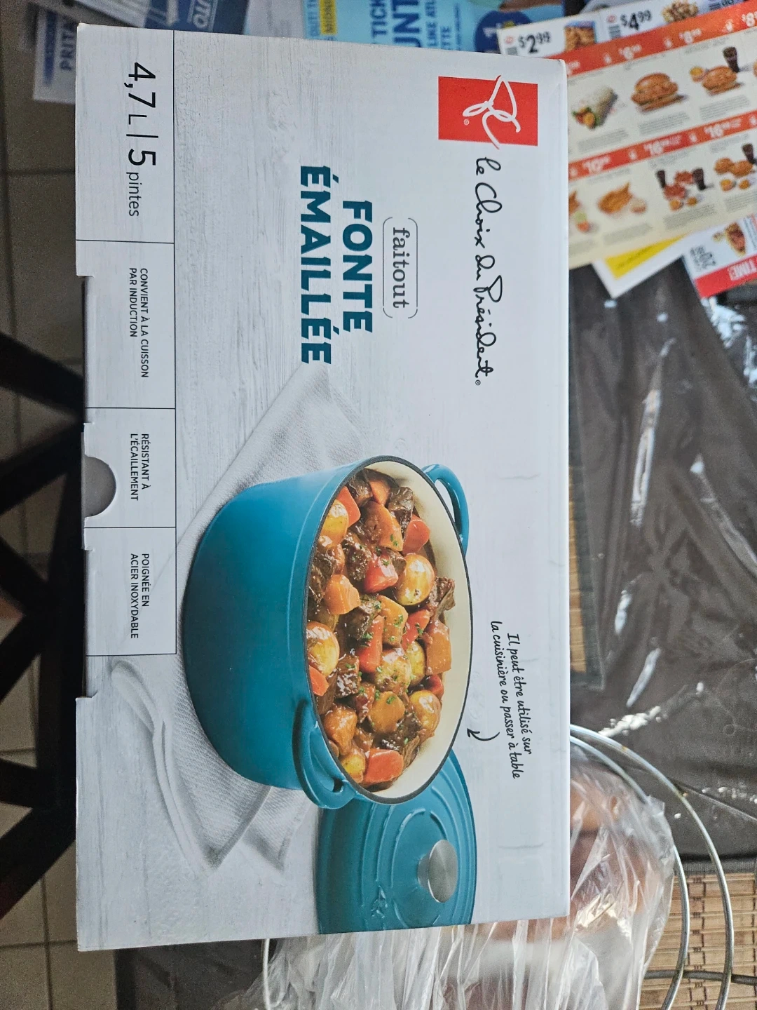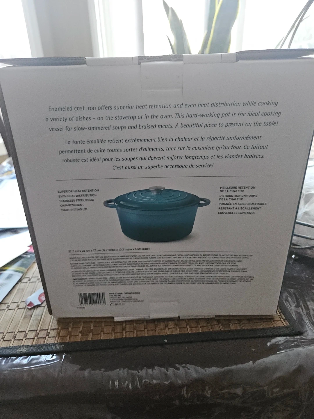 Selling a President's Choice enameled cast iron dutch oven. It's a 4.7L/5 Pintes size and comes in its original box. The dimensions are 32.3 cm x 26 cm x 17 cm (12.7 in/po x 10.2 in/po x 6.69 in/po). This dutch oven offers superior heat retention and even heat distribution, making it ideal for slow-simmered soups and braised meats