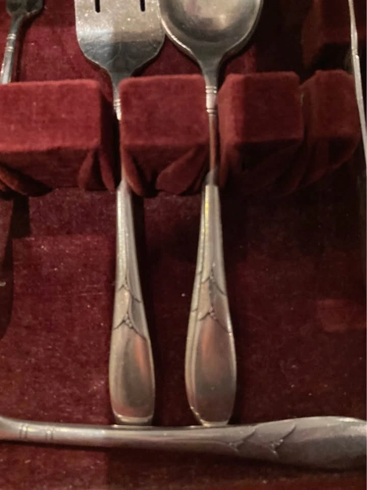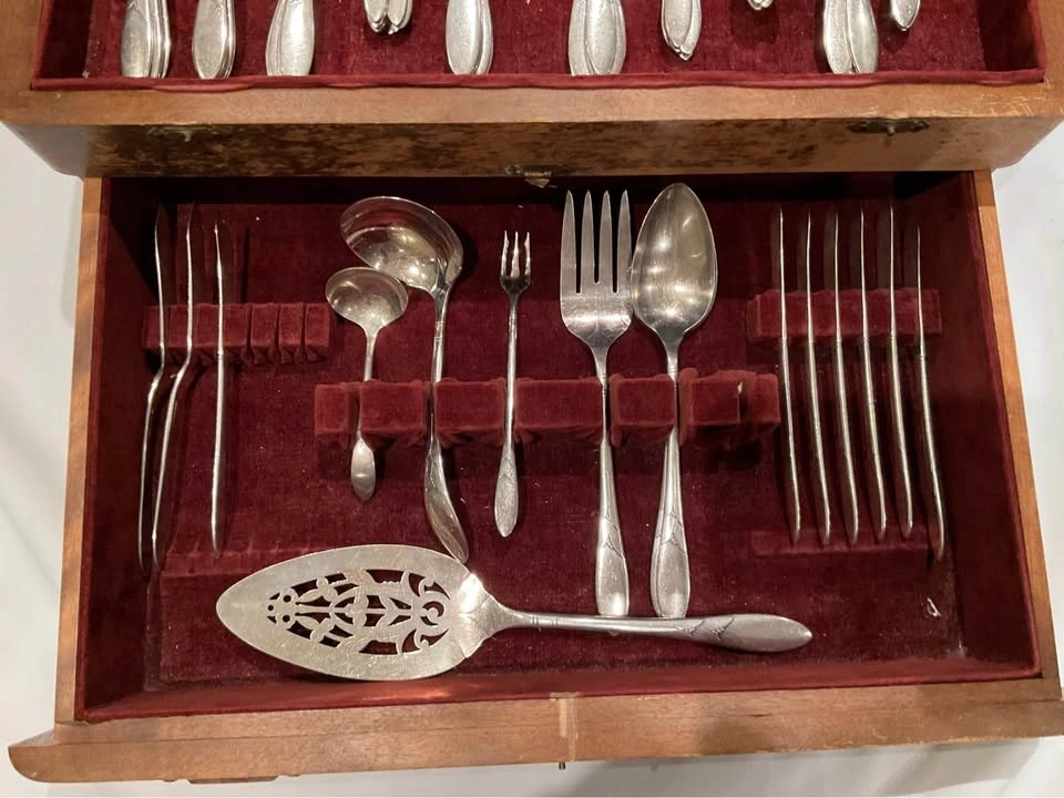 Classic 1881 Rogers Oneida Silver Plated ART DECO “Community Plate”. Original Box. Pattern: Lady Hamilton. 75 Pieces. Knives: 8, Large Spoons: 8, Soup Spoons: 8, Teaspoons: 9, Dinner Forks: 12, Dessert Forks: 12, Butter Spreaders: 6, Master Butter Knife: 2, Cake Server: 1, Serving Spoons: 2, Sugar Spoons: 3, Medium Ladle: 1, Small Ladle: 1, Serving Fork: 1. This is a vintage art deco set - a set this large is rare in its original case. Smoke & Pet Free Home. Cash Only - Richmond Hill / Bathurst & King Rd.