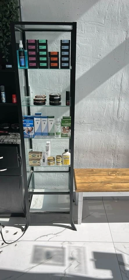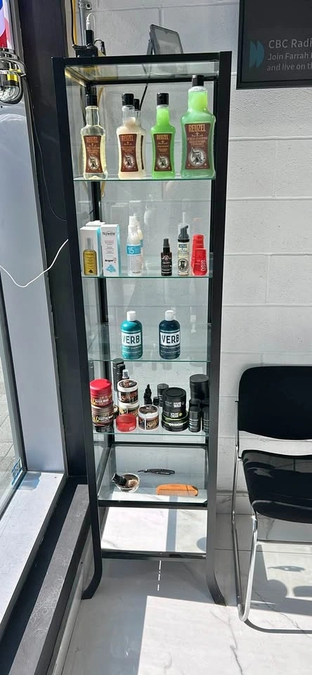 Sleek glass display cabinets with black metal frames and four adjustable glass shelves. Each unit features glass panels on all sides for full visibility and sits on four sturdy legs with a curved design at the base. I have two, and they are $50 each.