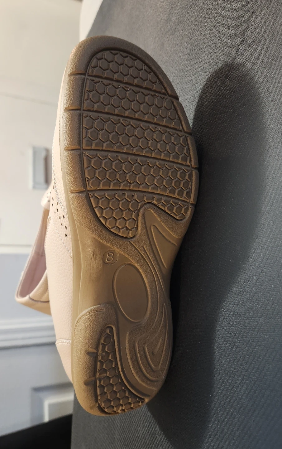 These women's slip-on loafers from Classic Editions feature a light pink colour and a perforated design. They are a size 8 with a comfortable fit. Slip-on style makes them easy to wear!