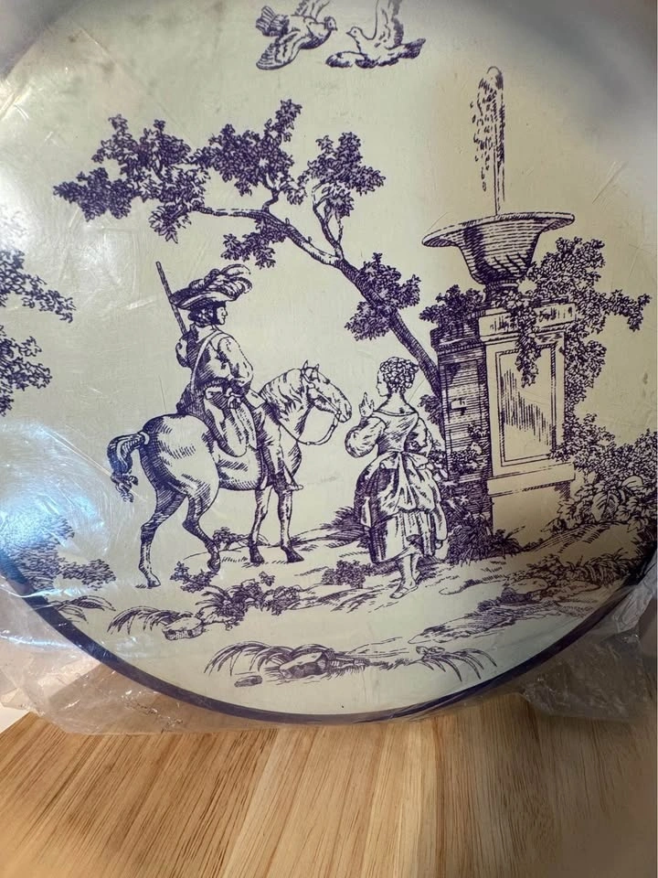 Set of four vintage decorative burner covers by Tabletops Unlimited, featuring the New England Toile (People) pattern. Includes two 10-inch and two 8-inch covers. They are blue and white and can also be used as a trivet or spoon rest. These are new, in their original packaging.