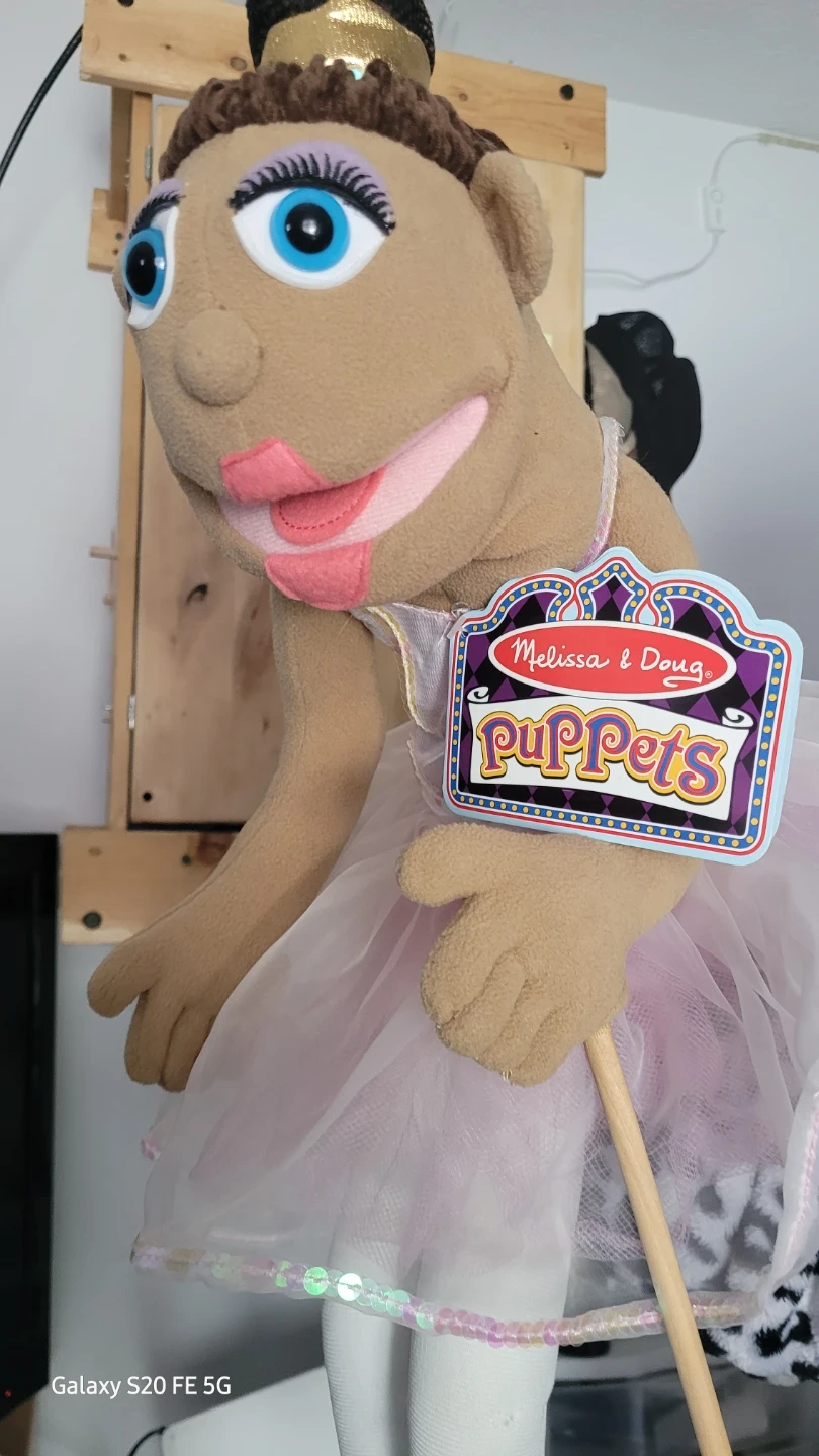 This is a Melissa & Doug Puppets ballerina puppet. It's dressed in a pink tutu and has a gold crown. Includes a wooden stick for control. Insert hand add voice and watch your little humans laugh and play. Tina ballerina is new, she has been discontinued this has driven her into a collectible!. 40.. obo.