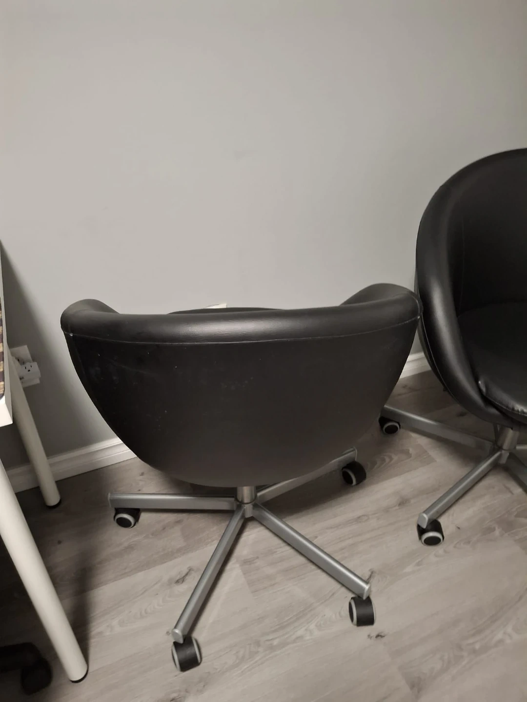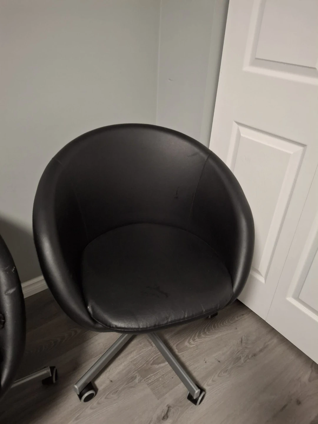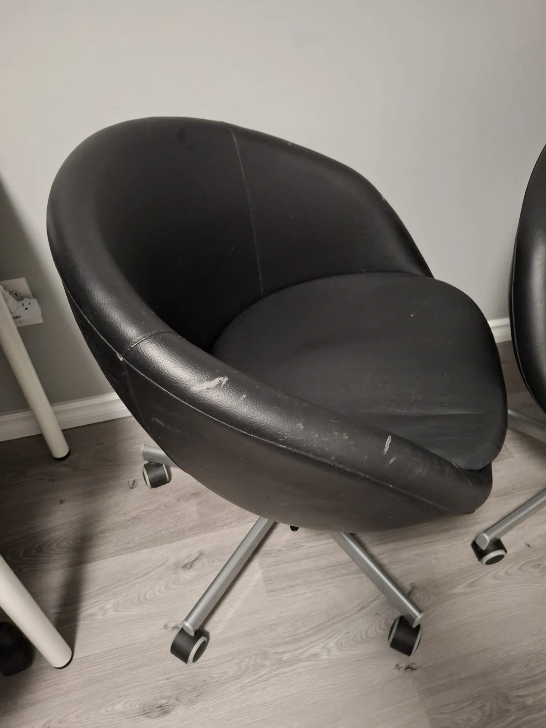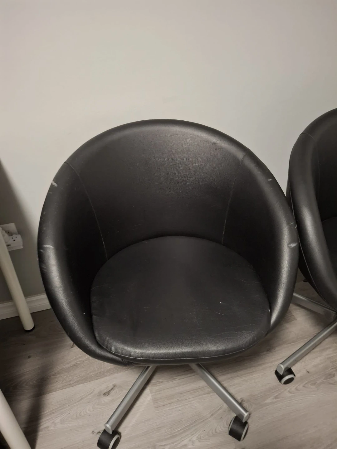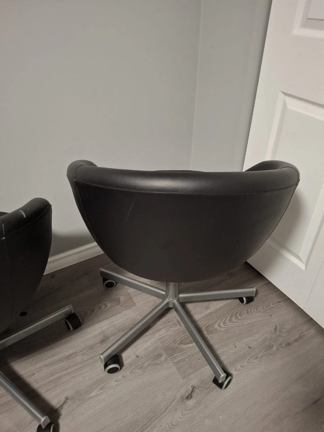 Comfortable black faux leather office chairs. It features a sturdy metal swivel base with wheels for easy mobility. These chairs are perfect for a home office or a small workspace. One of them has visible scratch marks from our cat.