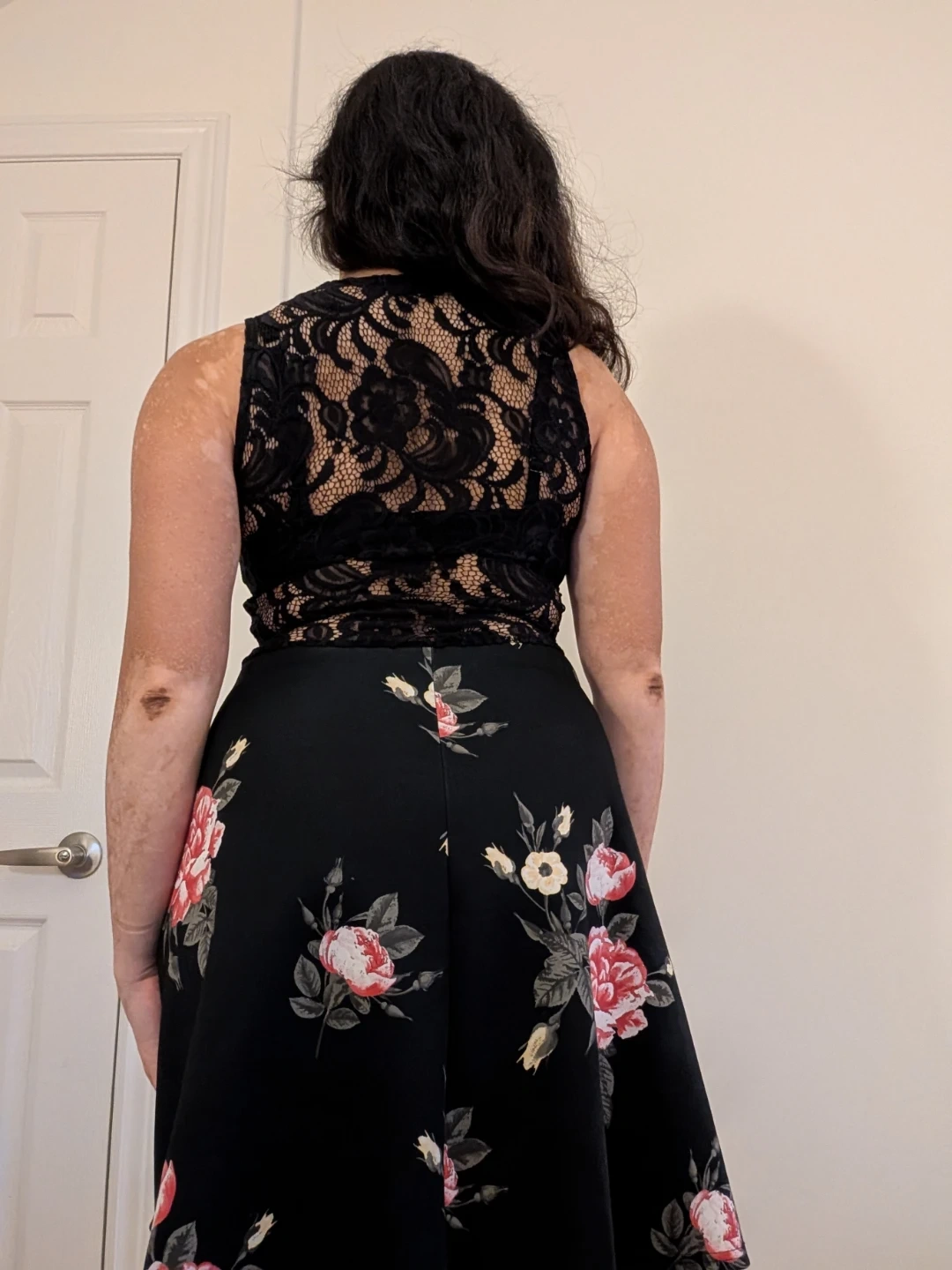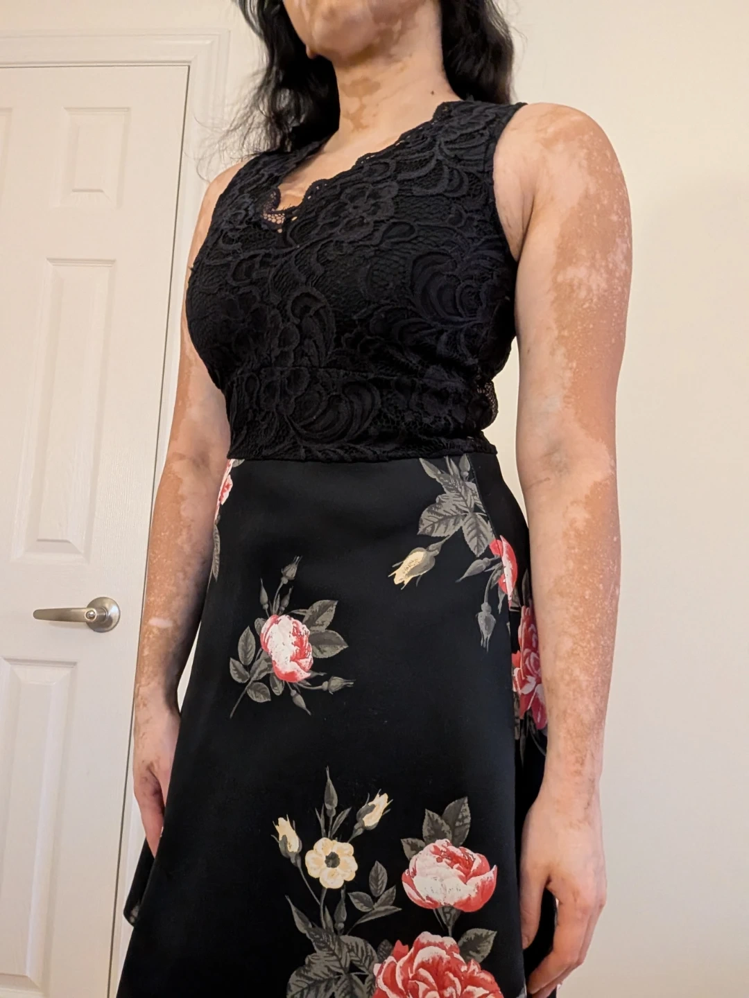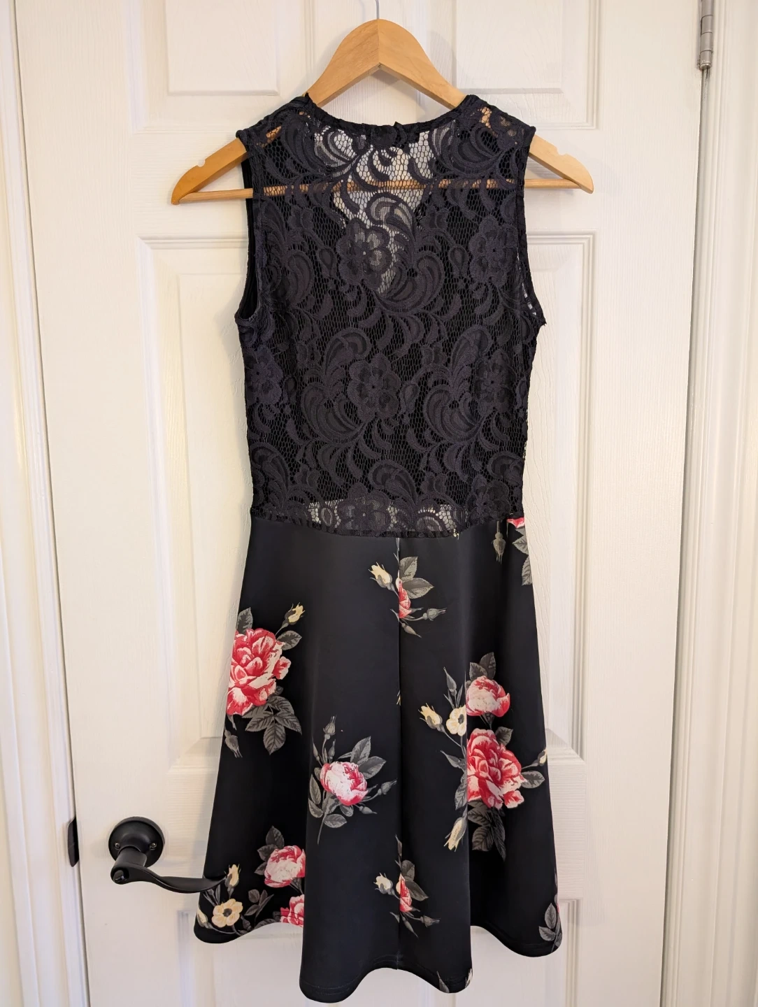 This is a sleeveless black dress with a lace overlay on the top and a floral print skirt. It has a V-neckline and a flattering fit-and-flare silhouette. The skirt reaches just above the knee, and the back is see-through.