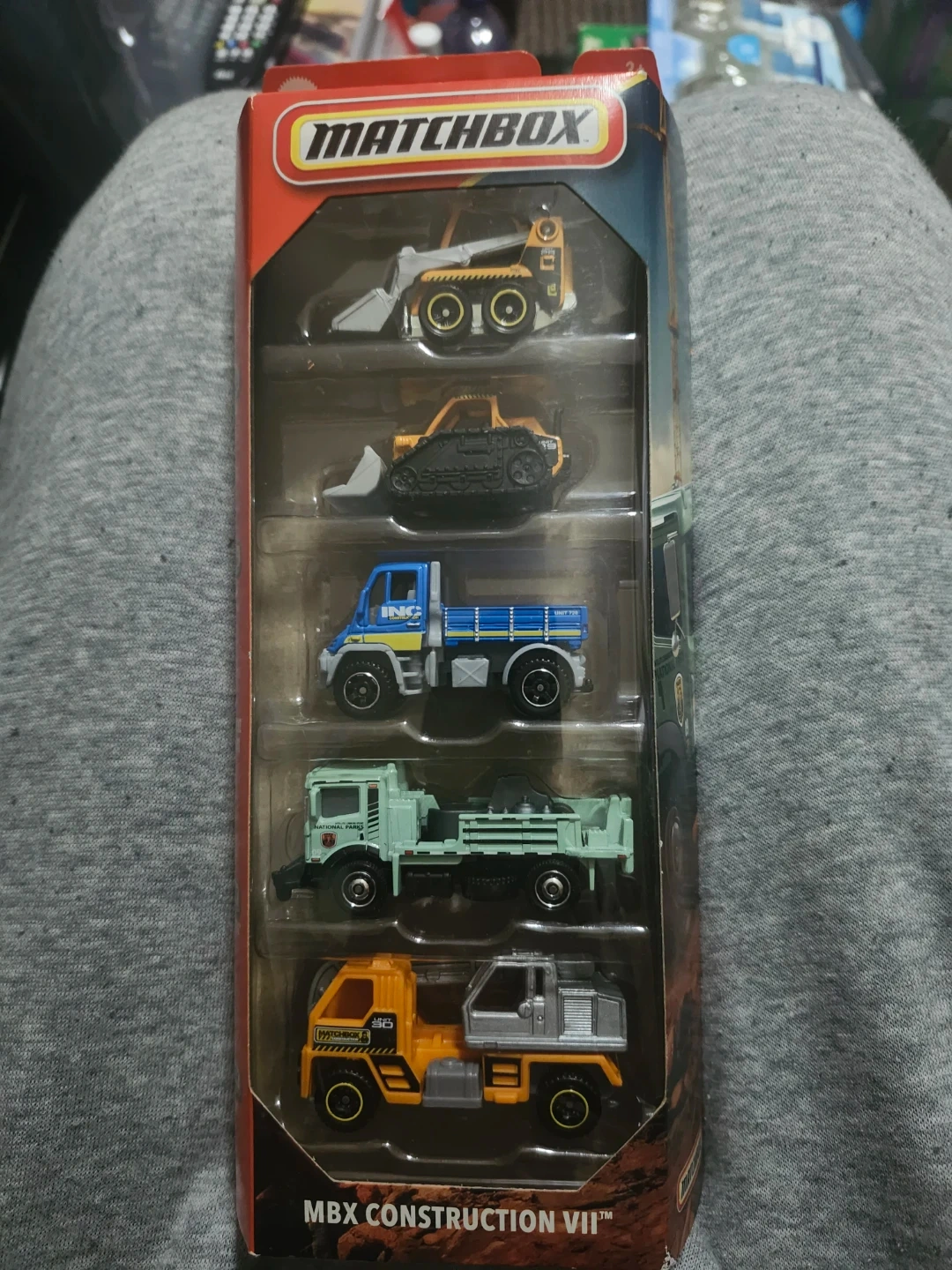 This is a Matchbox MBX Construction VII playset featuring five die-cast construction vehicles. It includes a skid-steer loader, a tracked loader, a blue flatbed truck, a light green National Parks truck, and a yellow and silver truck. They're great for imaginative play!