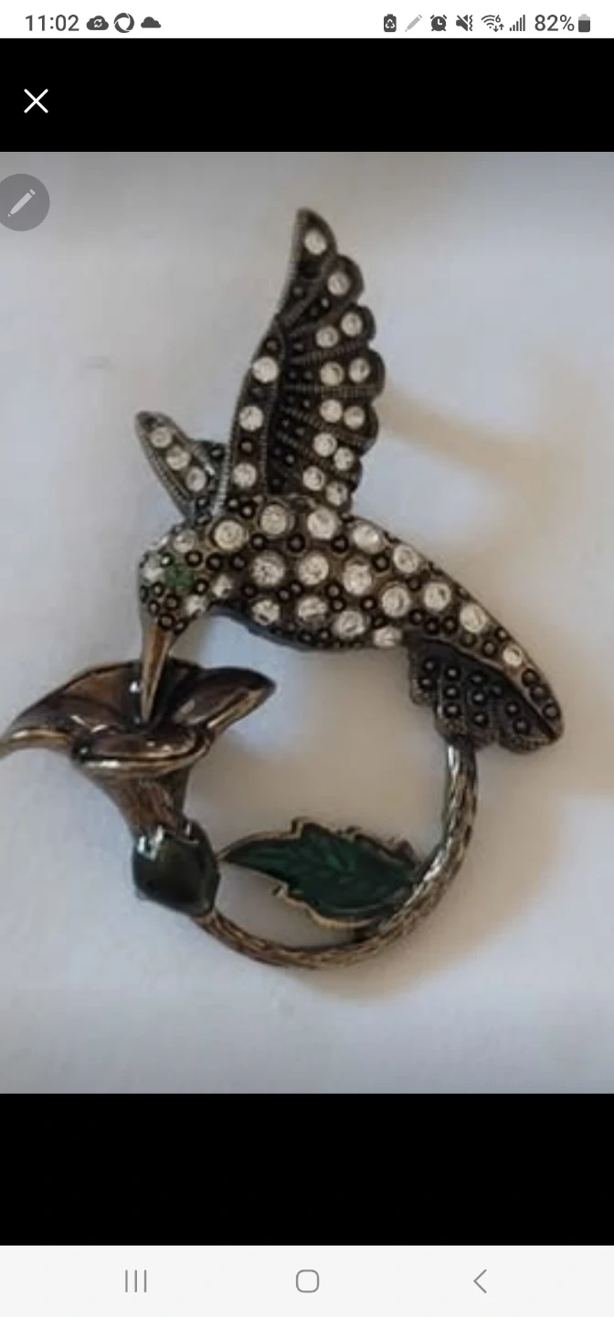 This brooch features a hummingbird hovering over a flower, embellished with clear rhinestones. The metal has an antique silver-toned finish. It's a charming accessory for any outfit!
