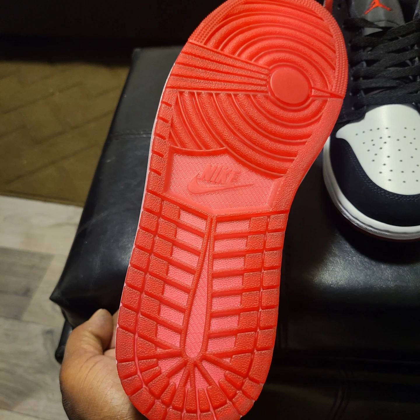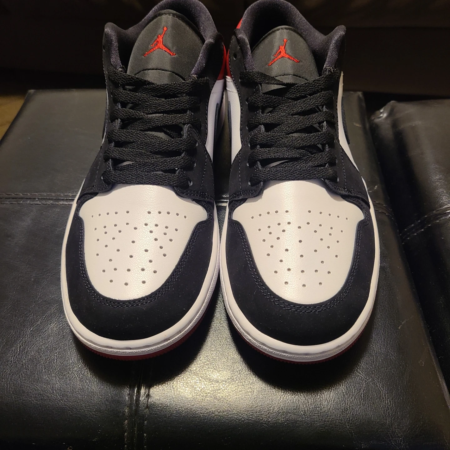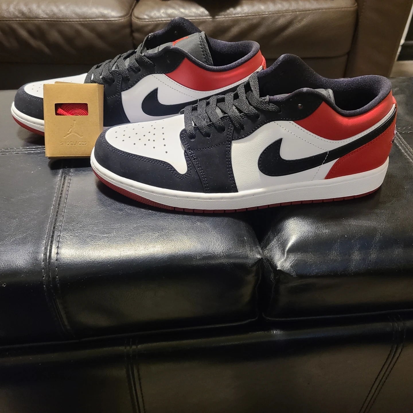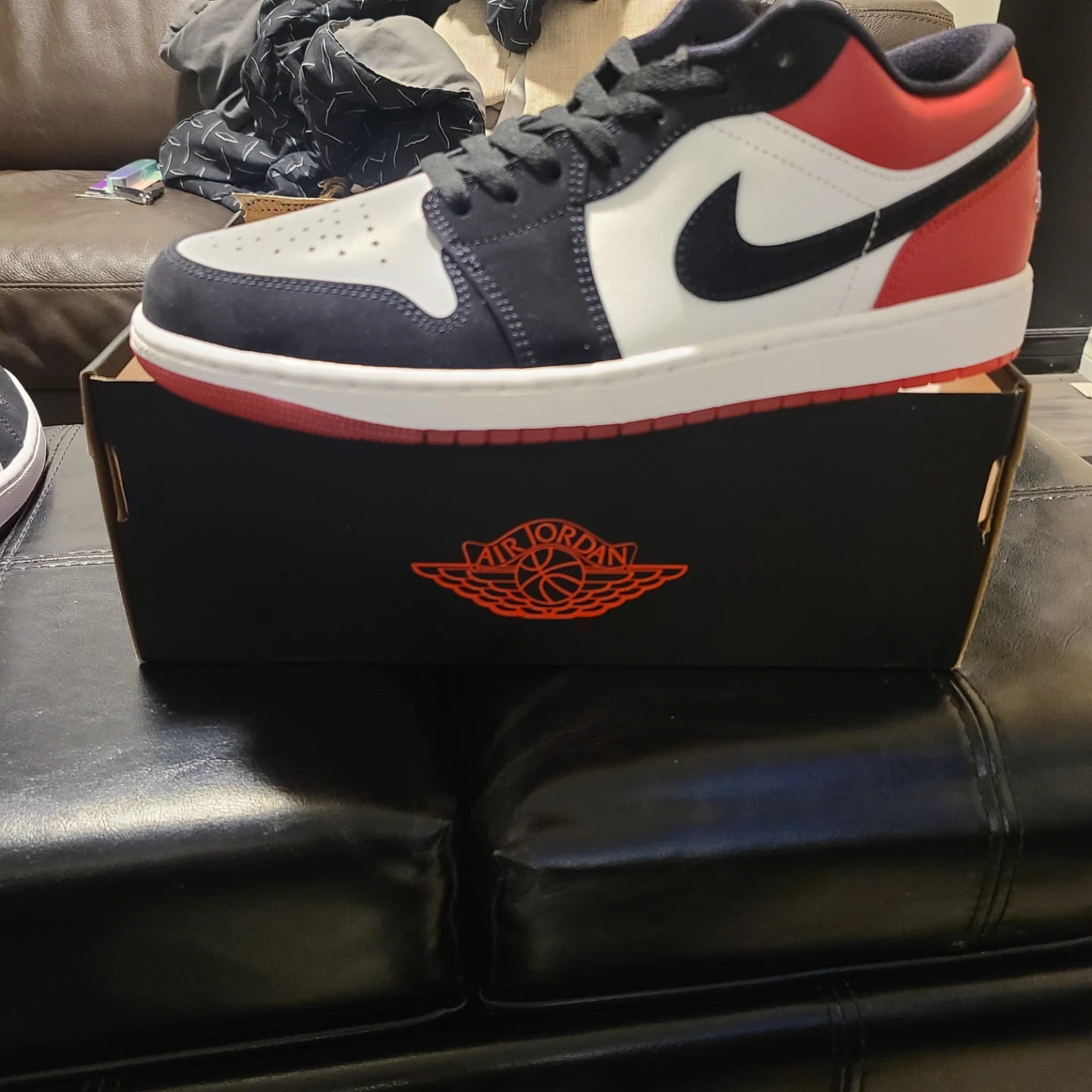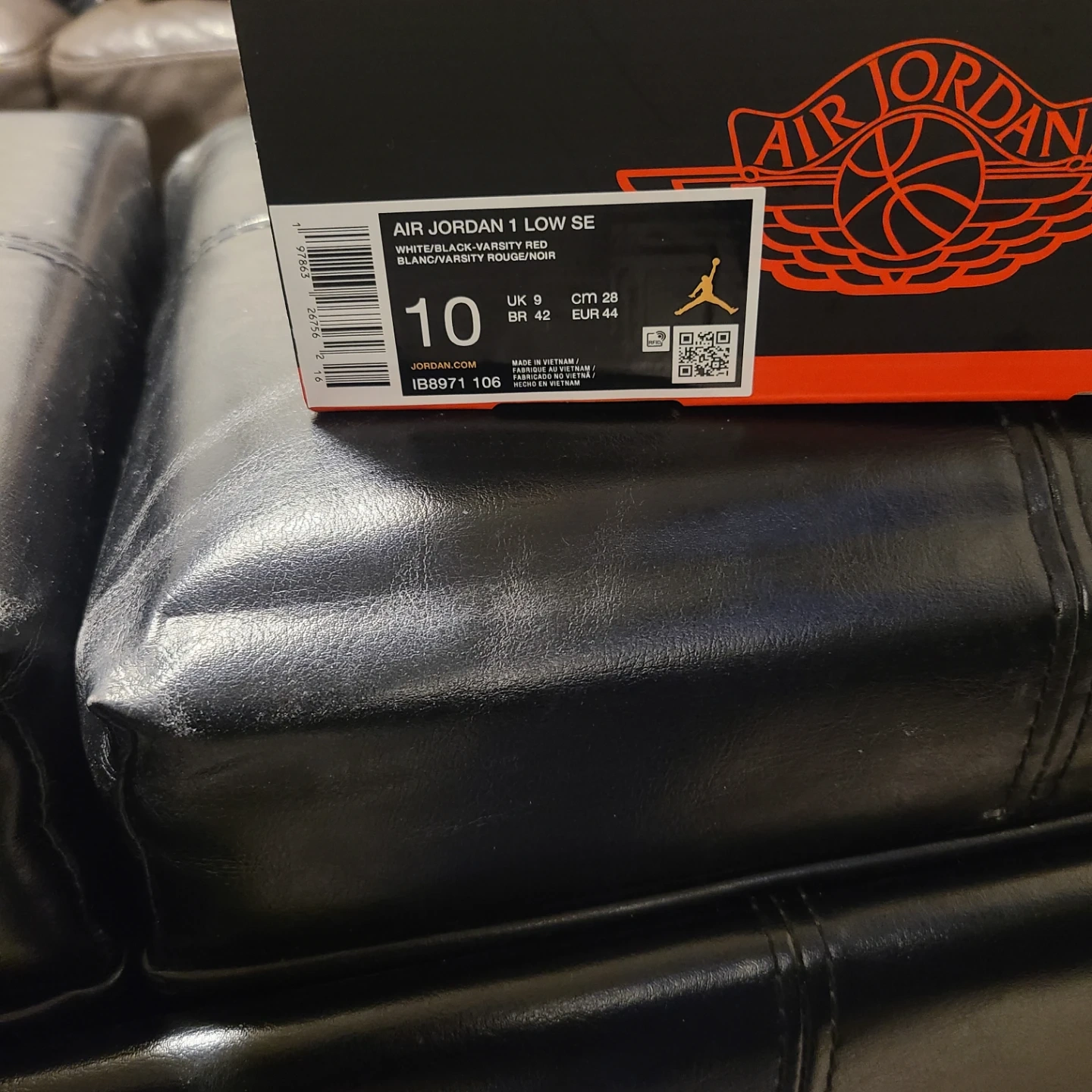 Selling a pair of Air Jordan 1 Low SE sneakers in white, black, and varsity red! They are a size 10. Comes with the box and an extra pair of red shoelaces! 2025 collection