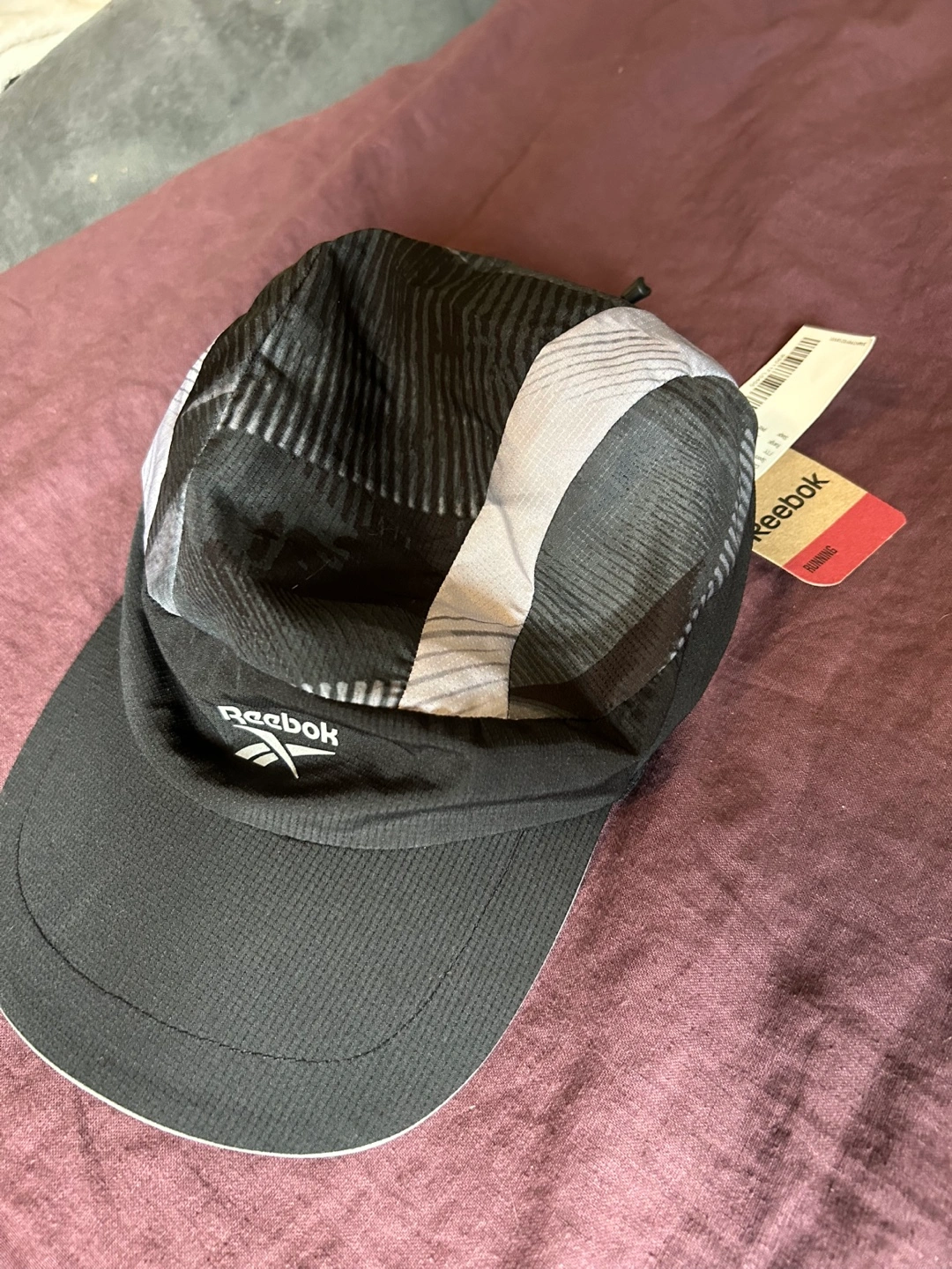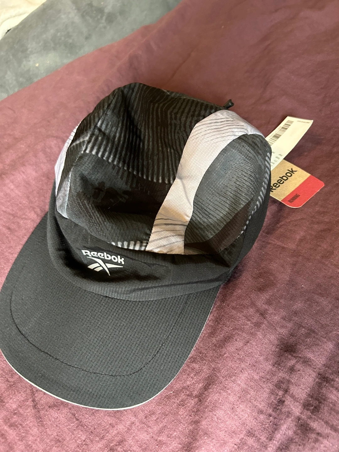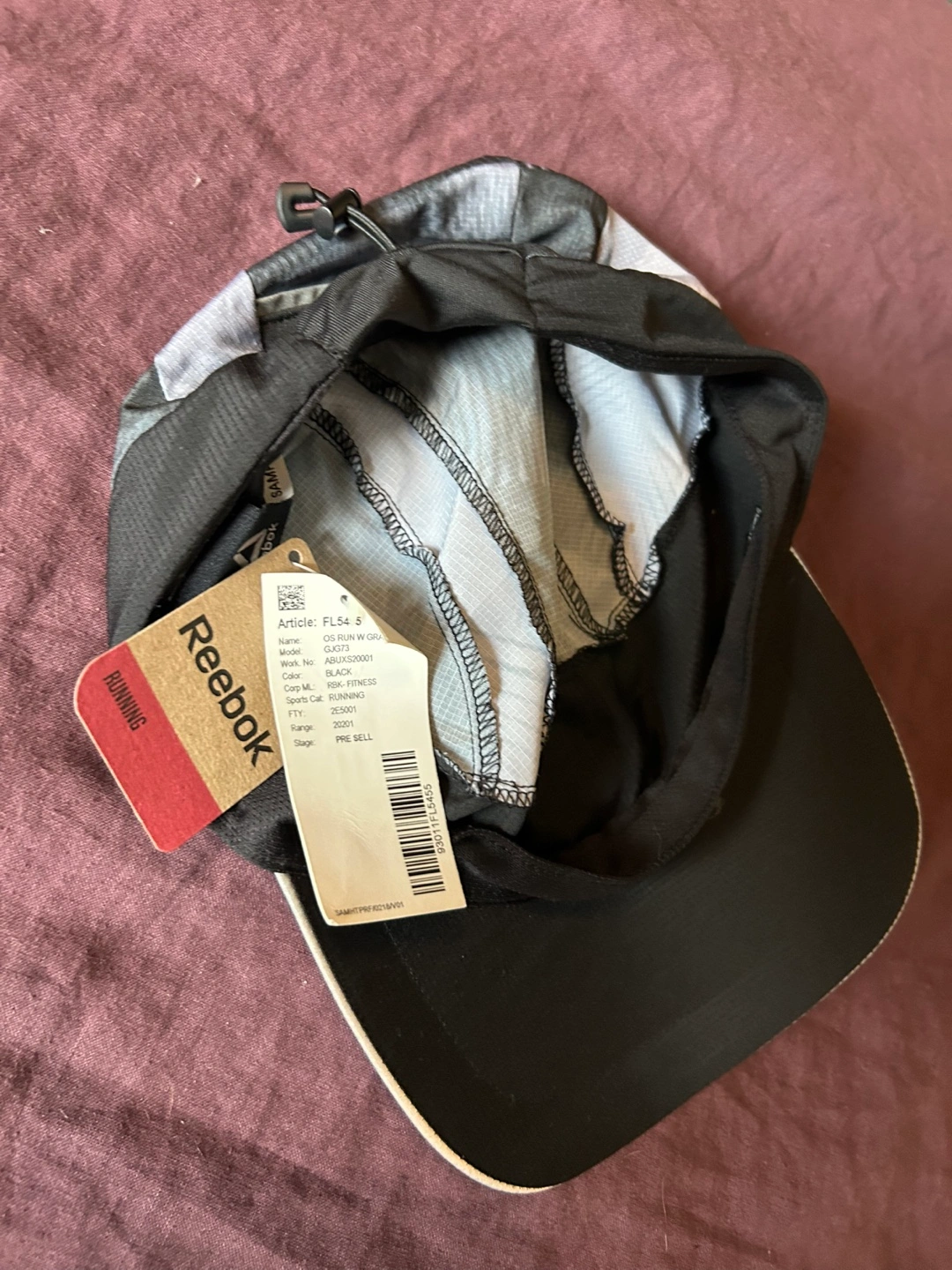 Reebok running hat. Black and grey colour scheme. Lightweight material. Perfect for workouts or casual wear. Never worn, new with tags.