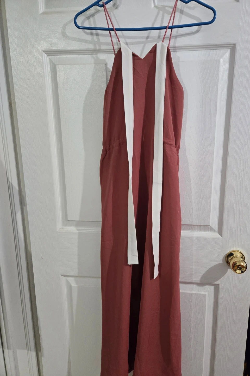 This is a women's red dress with white accent straps. It features thin spaghetti straps and a drawstring waist. The material appears to be lightweight and breathable. Great for warm weather!