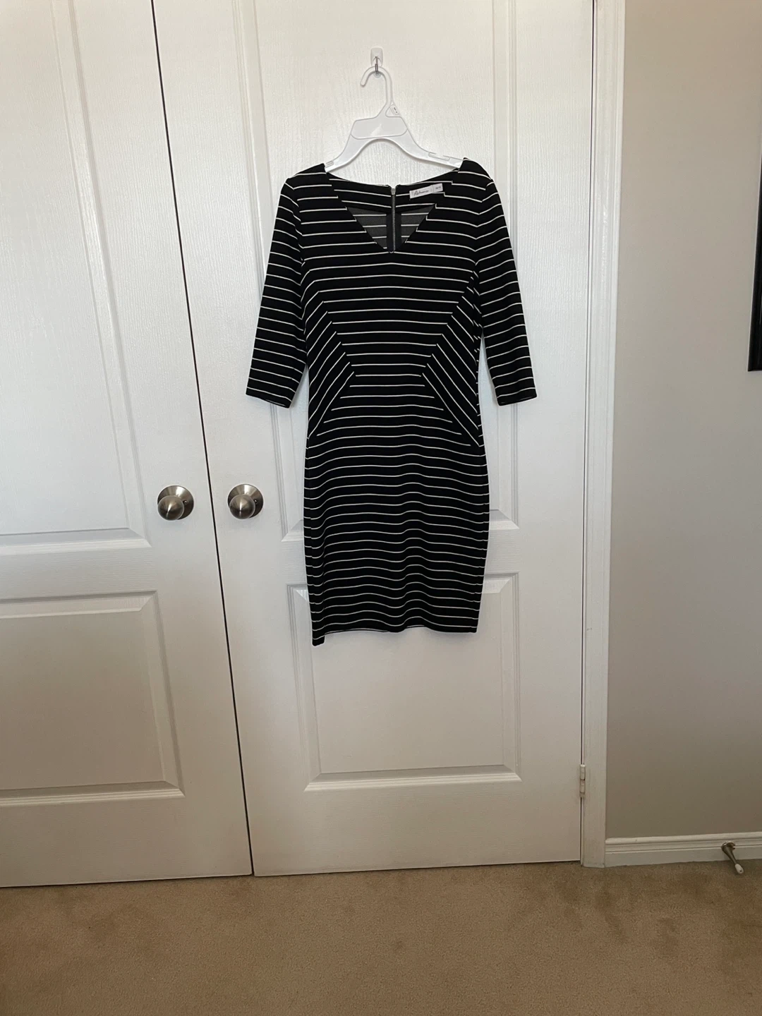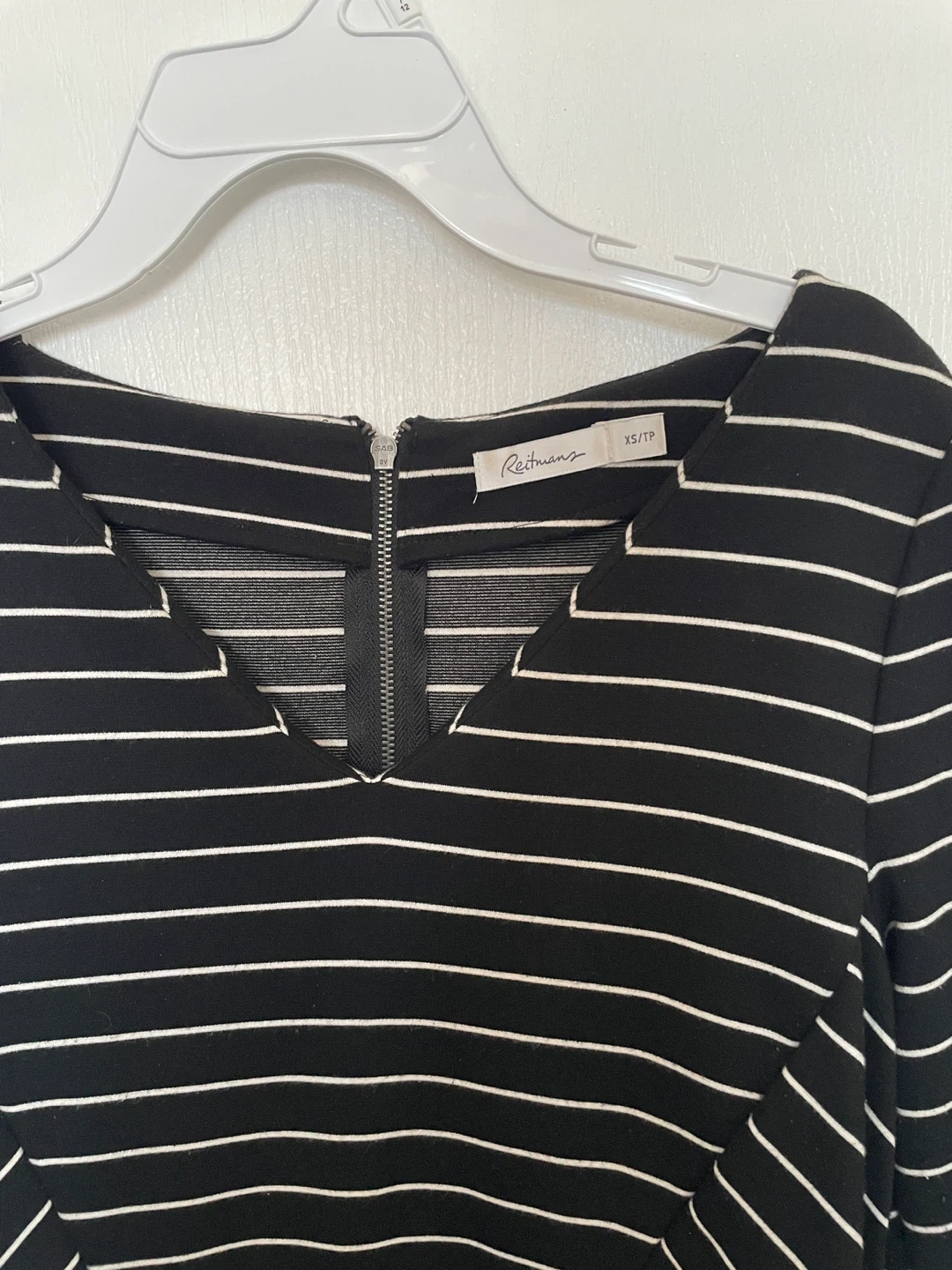 This Reitmans dress features a classic black and white stripe pattern. It has a V-neckline with a zippered closure at the back. The dress is size XS.