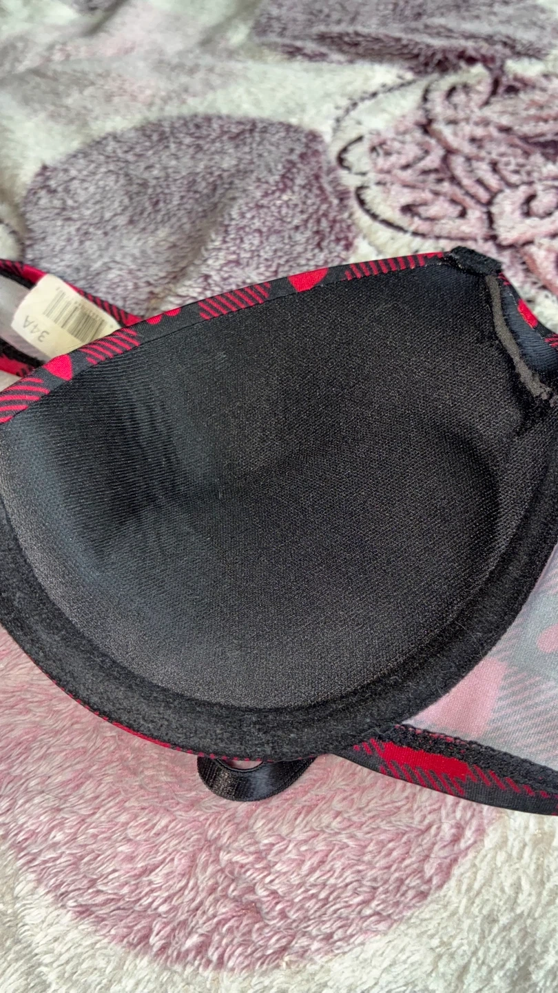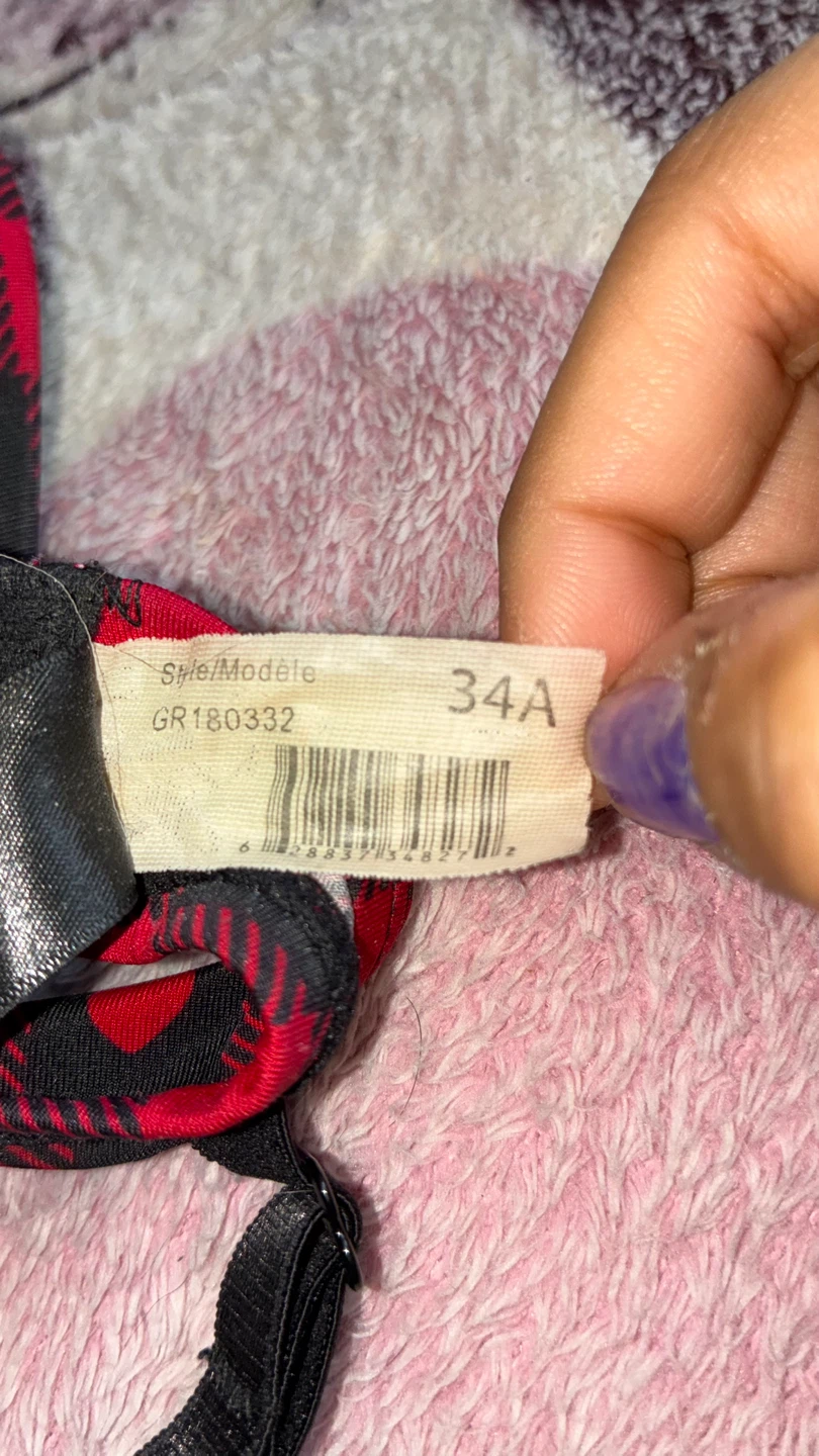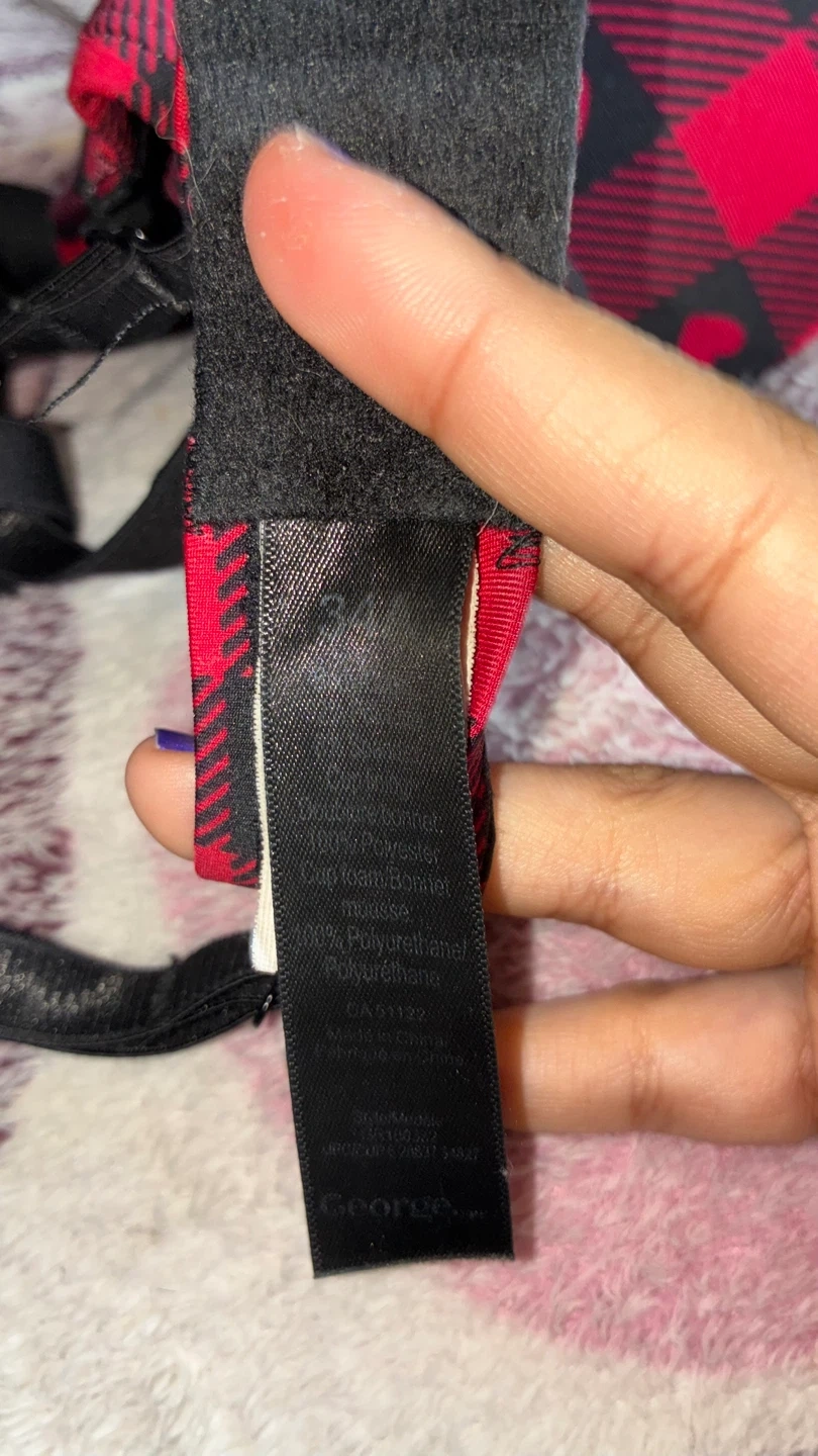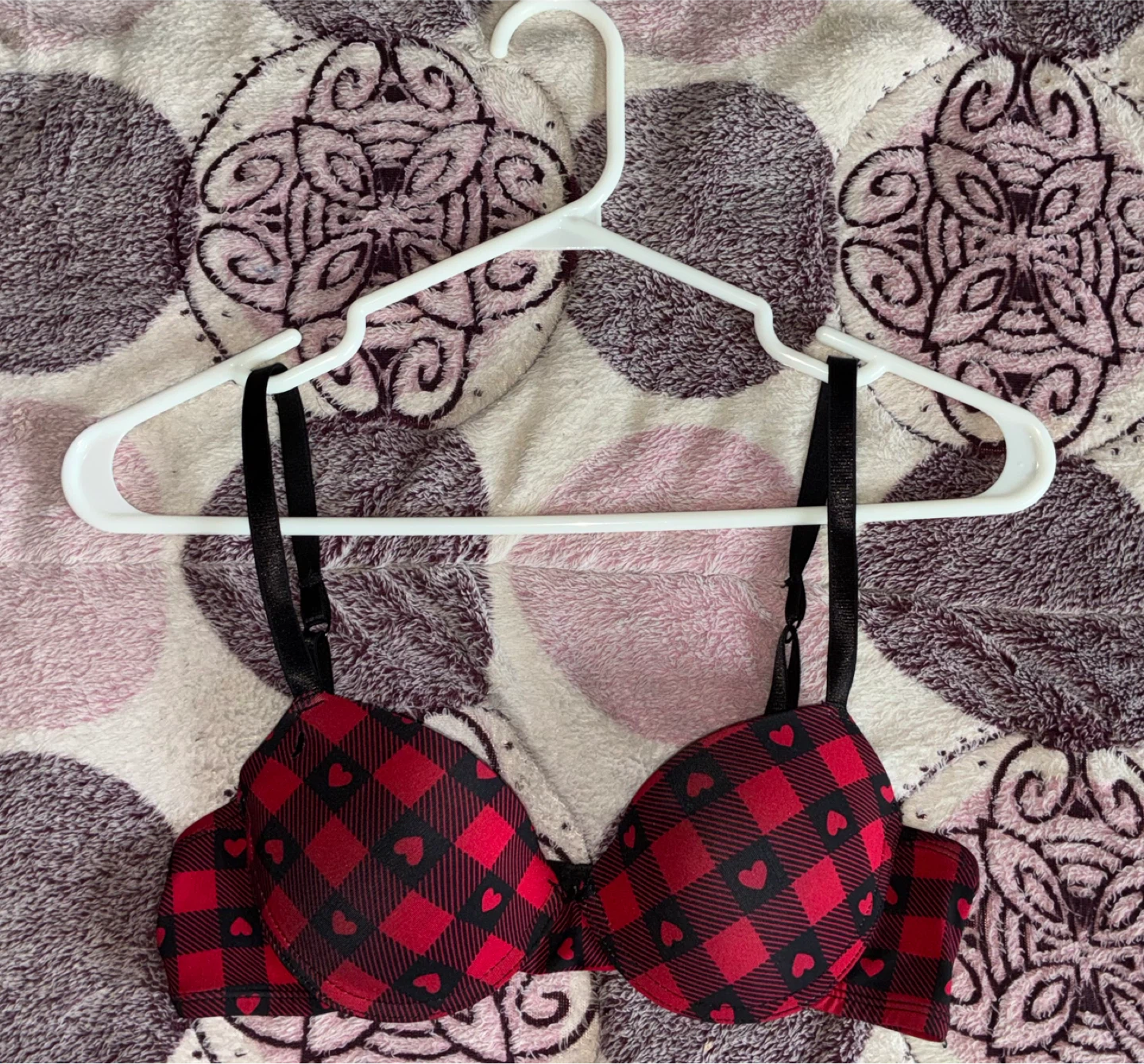 Red and black plaid bra with small heart print. Features underwire and adjustable straps. Outer shell made of 100% Polyester, with 100% Polyurethane foam and 100% Polyester lining. From Walmart