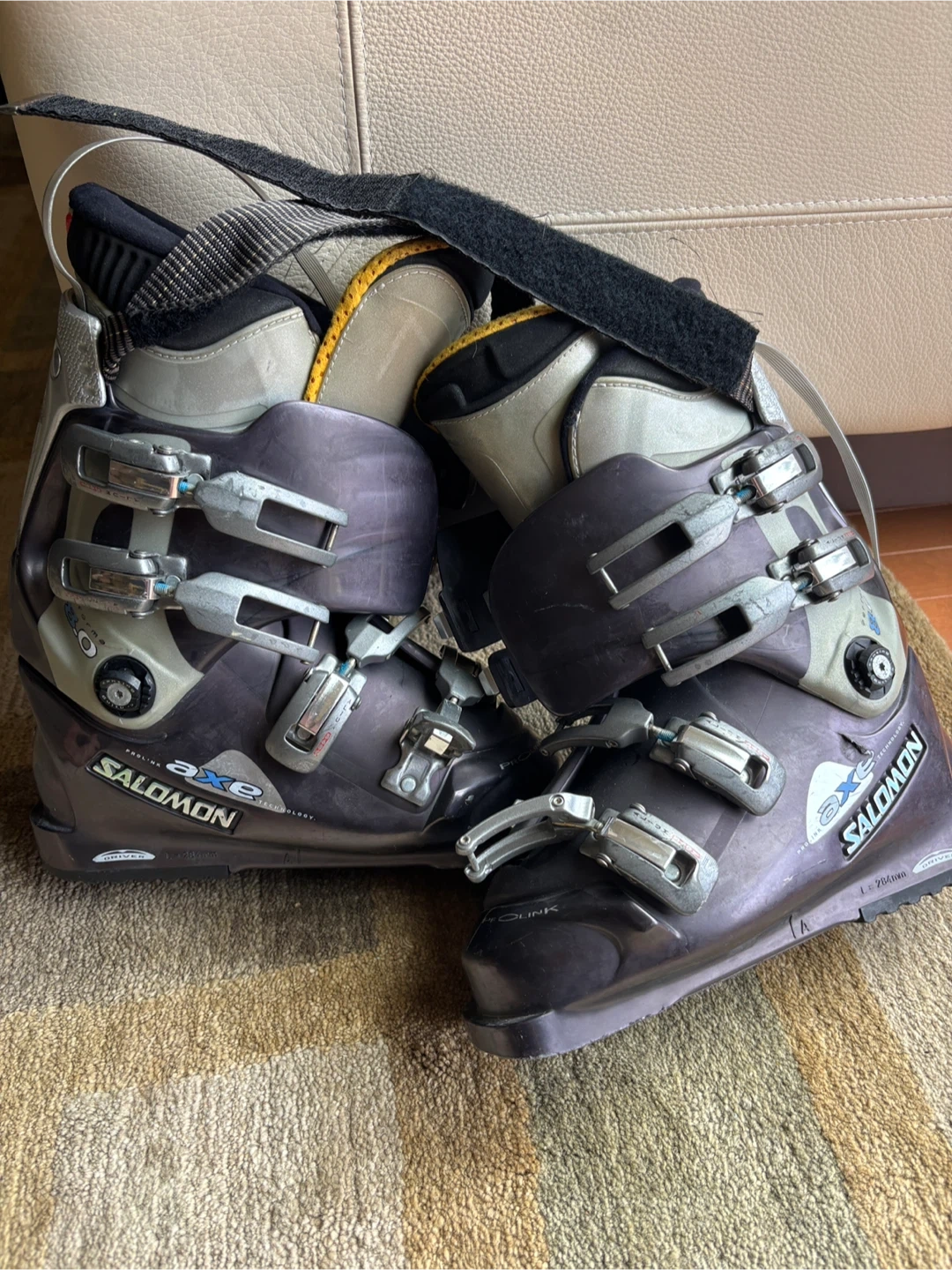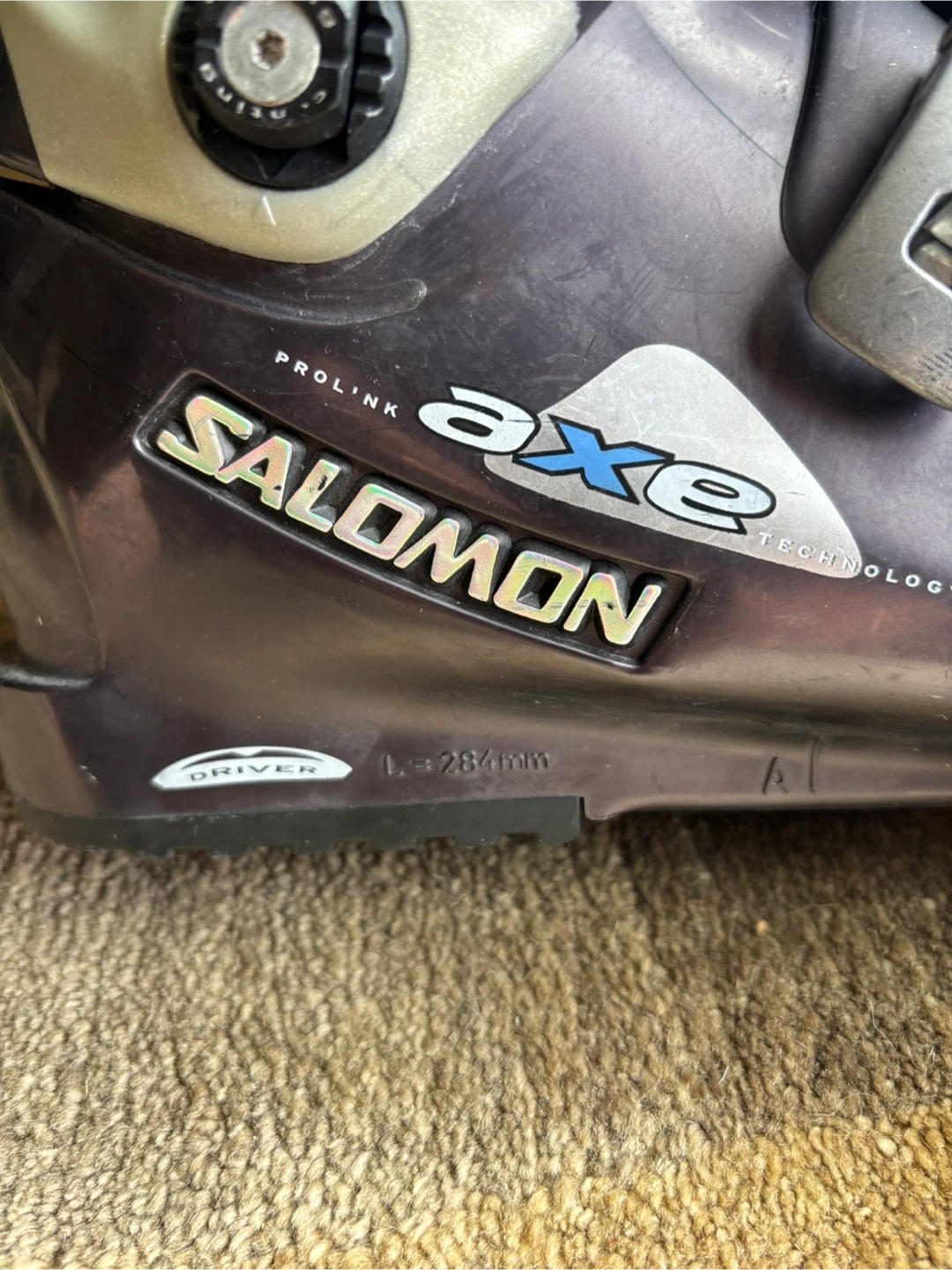 Women's Salomon AXE ski boots with a 284mm sole length. Size 38, US women's 6.5. Features lateral power frame technology. They have a Supermax Powerpack therm-ic system. They show some signs of wear.
