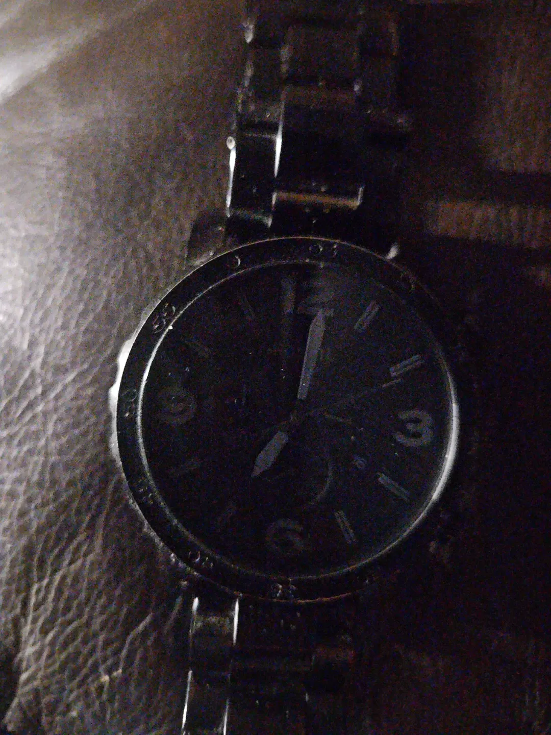 Selling a Fossil men's watch. It has a black metal band and face. It's in good condition, ready for a new wrist has a little scratch.