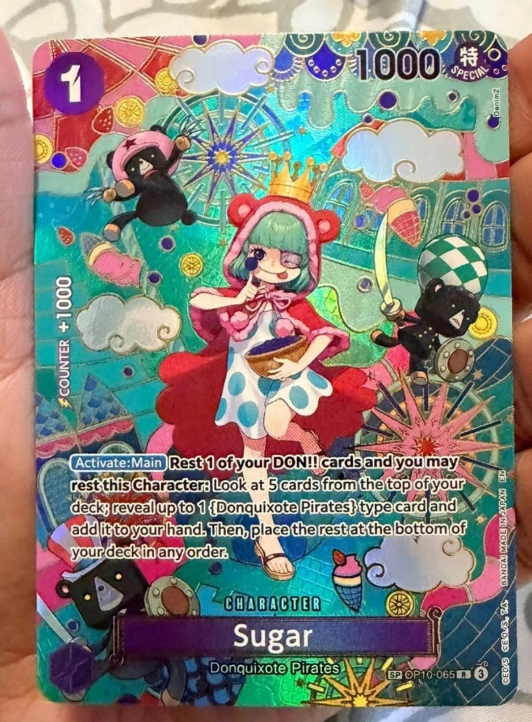 This is a Sugar Character card from the One Piece Card Game. It's part of the Donquixote Pirates faction. The card has an effect that allows you to search your deck for a Donquixote Pirates card.
