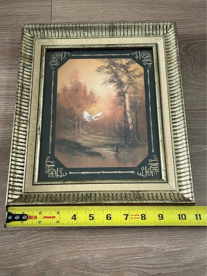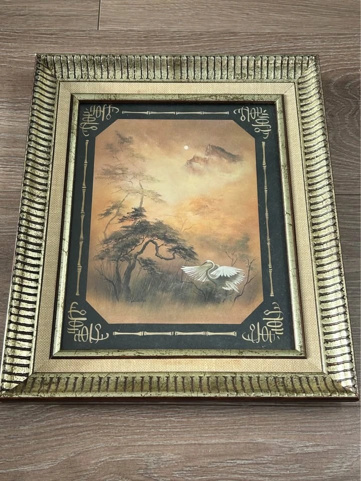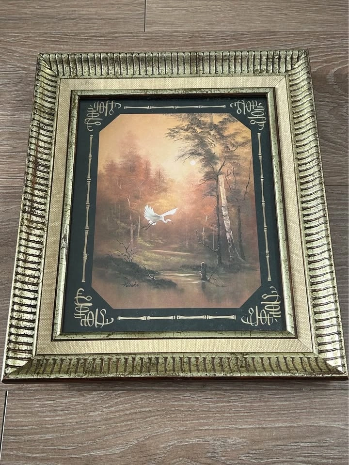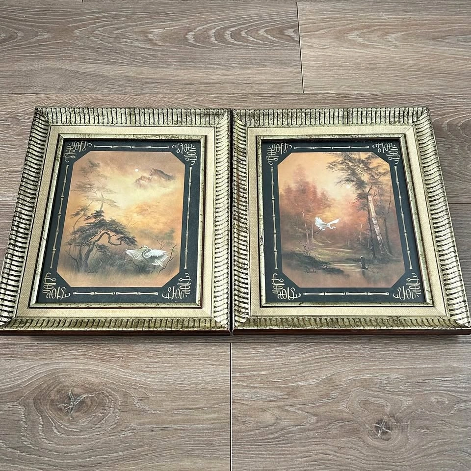 Vintage Framed Crane Landscape Art Prints – Matching Pair